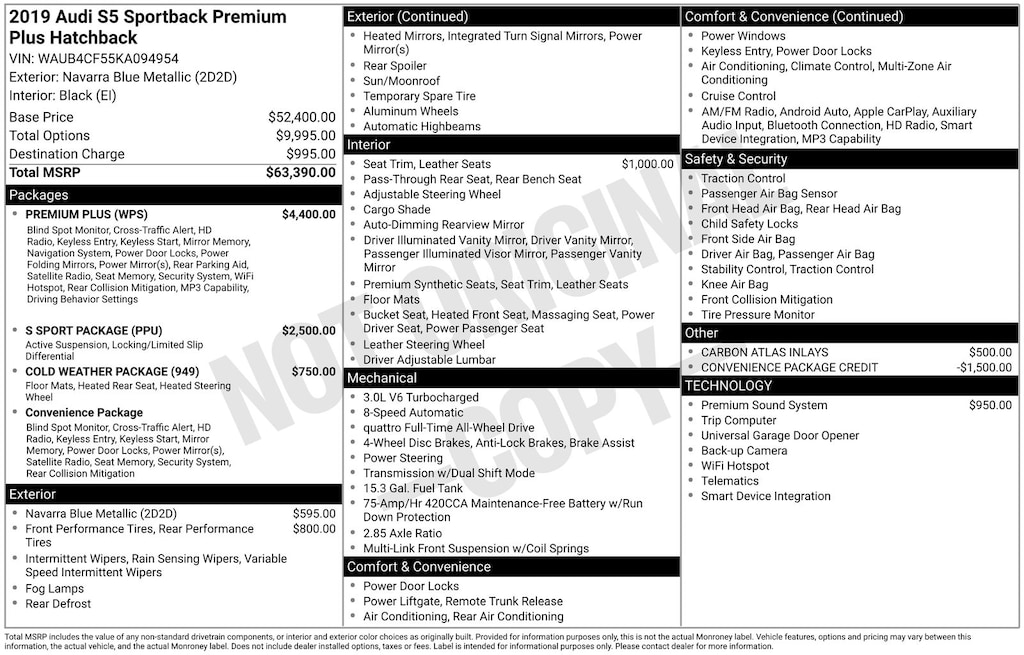 Cold Weather Package (All Weather Floor Mats, Heated Rear Seats, and Heated Steering Wheel), Convenience Package (Alarm System w/Motion Sensors, Audi Advanced Key, Audi pre sense rear, Audi Side Assist, Auto-Dimming Exterior Mirrors, Driver Seat Memory, and SiriusXM All Access Service), Premium Plus (Audi MMI Navigation Plus w/MMI Touch, Parking System Plus (Front/Rear Acoustic Sensors), Power Folding Exterior Mirrors, and Rear Seat USB Charge Ports), S Sport Package (Front & Rear Red Brake Calipers, Sport Adaptive Damping Suspension, and Sport Rear Differential), 10 Speakers, 4-Wheel Disc Brakes, ABS brakes, Air Conditioning, Alloy wheels, AM/FM radio, Audi smartphone interface (Apple CarPlay/Android Auto), Auto High-beam Headlights, Auto-dimming Rear-View mirror, Automatic temperature control, Bang & Olufsen Sound System w/3D Sound, Brake assist, Bumpers: body-color, Carbon Atlas Inlays, Compass, Delay-off headlights, Driver door bin, Driver vanity mirror, Dual front impact airbags, Dual front side impact airbags, Electronic Stability Control, Emergency communication system: Audi connect CARE, Exterior Parking Camera Rear, Four wheel independent suspension, Front anti-roll bar, Front Bucket Seats, Front Center Armrest, Front dual zone A/C, Front fog lights, Front reading lights, Garage door transmitter: HomeLink, Heated door mirrors, Heated Front S Sport Seats, Heated front seats, Illuminated entry, Knee airbag, Leather Shift Knob, Leather steering wheel, Leather/Alcantara Seating Surfaces, Low tire pressure warning, Occupant sensing airbag, Outside temperature display, Overhead airbag, Overhead console, Panic alarm, Passenger door bin, Passenger vanity mirror, Power door mirrors, Power driver seat, Power Liftgate, Power moonroof, Power passenger seat, Power steering, Power windows, Radio data system, Radio: Audi Sound System, Rain sensing wipers, Rear air conditioning, Rear anti-roll bar, Rear reading lights, Rear seat center armrest, Rear window defroster, Remote keyless entry, Speed control, Speed-sensing steering, Speed-Sensitive Wipers, Split folding rear seat, Spoiler, Sport steering wheel, Steering wheel mounted audio controls, Tachometer, Telescoping steering wheel, Tilt steering wheel, Traction control, Trip computer, Turn signal indicator mirrors, Variably intermittent wipers, Wheels: 18" x 8.5" 5-Double-Spoke-Star Design, and Wheels: 19" x 8.5" 5-Spoke-Cavo Design. Recent Arrival! 21/30 City/Highway MPG