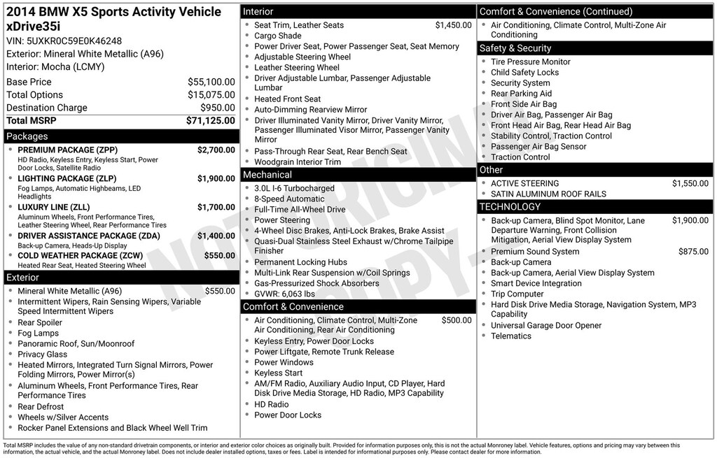 White Metallic 2014 BMW X5 xDrive35i AWD 8-Speed Automatic 3.0L I6 DOHC 24V TwinPower Turbo Mocha Leather.