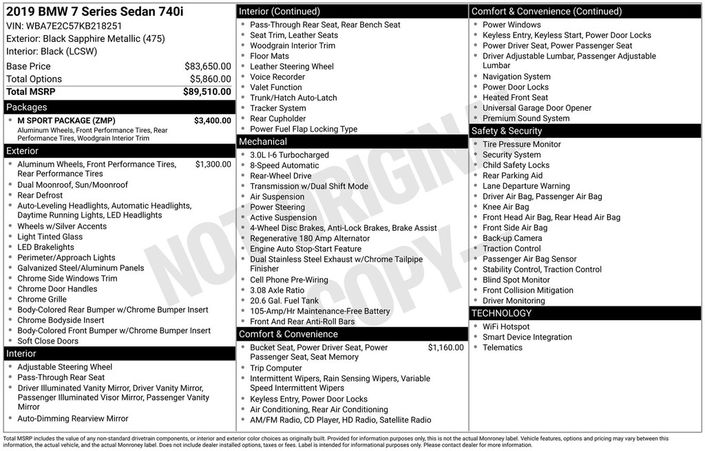 Black Sapphire Metallic 2019 BMW 7 Series 740i RWD 8-Speed Automatic 3.0L I6 DOHC 24V TwinPower Turbo Black Leather.