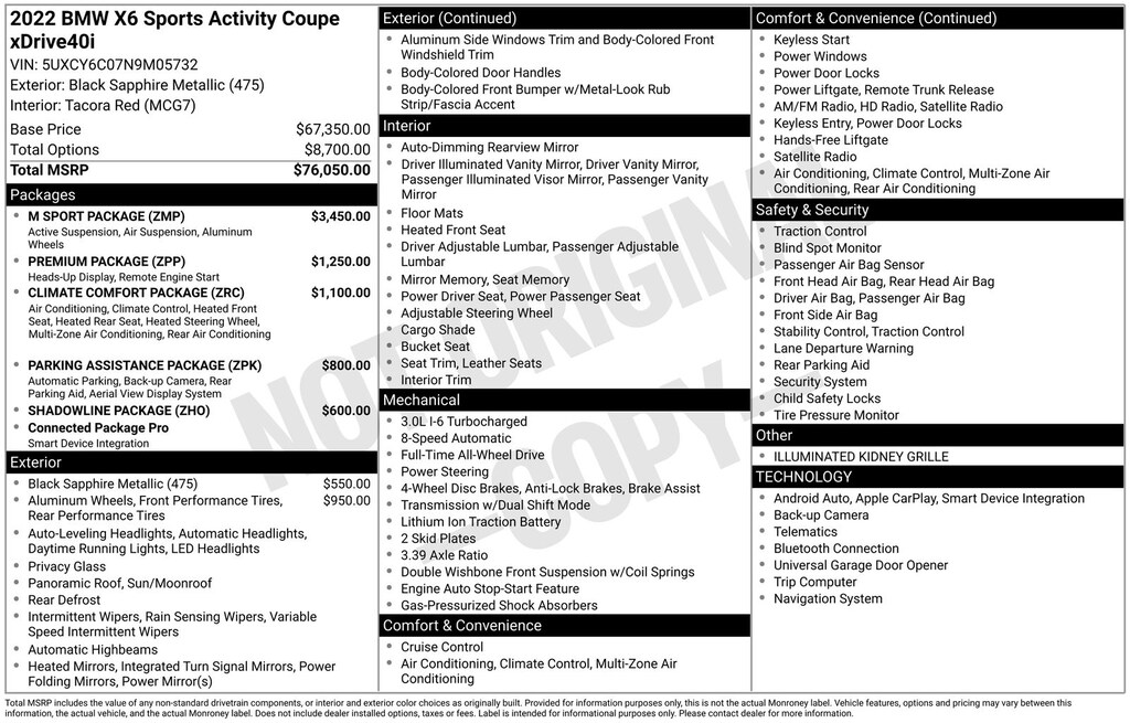 Black Sapphire Metallic 2022 BMW X6 xDrive40i AWD 8-Speed Automatic Sport 3.0L I6 DOHC 24V Turbocharged Red Leather.