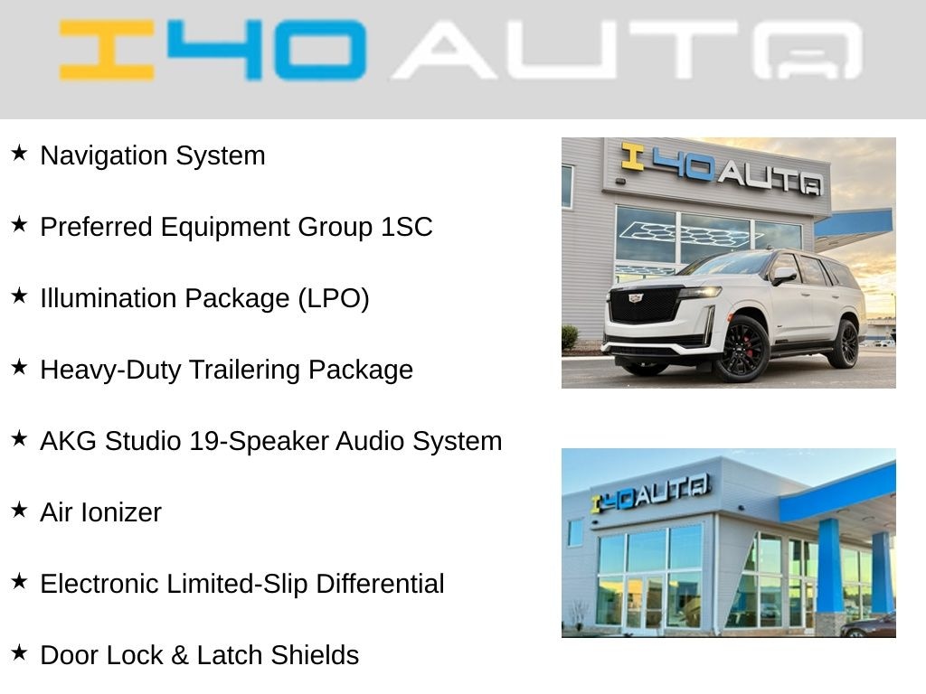 Heavy-Duty Trailering Package (2-Speed Active Transfer Case, Extra Capacity Cooling System, Trailer Tire Pressure Monitoring System, Trailering Assist Guidelines, and Wired Auxiliary Trailer Camera (LPO)), Illumination Package (LPO) (Illuminated Cargo Sill Plate (LPO), Illuminated Front Door Sill Plates (LPO), and Puddle Lamps w/Cadillac Crest (LPO)), Preferred Equipment Group 1SC (Air Ionizer, AKG Studio 19-Speaker Audio System, Automatic Emergency Braking, Body-Color Door Handles, Door Lock & Latch Shields, Electronic Cruise Control w/Set & Resume Speed, Electronic Limited-Slip Differential, Enhanced Automatic Parking Assist, Glass Breakage Sensor, Hitch Guidance w/Hitch View, In-Vehicle Trailering System App, Integrated Trailer Brake Controller, Lane Keep Assist w/Lane Departure Warning, Power Panoramic Tilt-Sliding Sunroof, Rear Camera Mirror, Rear Camera Mirror Washer, Rear Cross Traffic Alert, Reconfigurable Full-Color Head-Up Display, Running Board Assist Steps, Theft-Deterrent Alarm System, Trailer Side Blind Zone Alert, Vehicle Inclination Sensor, and Vehicle Interior Movement Sensor), 4WD, Brandy With Very Dark Atmosphere Accents Leather, 16.9" Diagonal OLED Infotainment Screen, 19 Speakers, 2-Presets Memory For Driver Seat Adjuster, 3.23 Axle Ratio, 3rd row seats: split-bench, 4-Way Power Driver Lumbar Seat Adjuster, 4-Way Power Front Passenger Lumbar Seat Adjuster, 4-Wheel Disc Brakes, 8-Way Power Driver Seat Adjuster, 8-Way Power Front Passenger Seat Adjuster, ABS brakes, Adaptive suspension, Air Conditioning, Alloy wheels, AM/FM radio: SiriusXM with 360L, Apple CarPlay/Android Auto, Audio memory, Auto High-beam Headlights, Auto tilt-away steering wheel, Auto-dimming door mirrors, Auto-dimming Rear-View mirror, Automatic temperature control, Brake assist, Bumpers: body-color, Compass, Delay-off headlights, Driver door bin, Driver vanity mirror, Dual front impact airbags, Dual front side impact airbags, Electronic Stability Control, Emergency communication system: OnStar and Cadillac connected services capable, Four wheel independent suspension, Front anti-roll bar, Front Bucket Seats, Front Center Armrest w/Storage, Front dual zone A/C, Front reading lights, Fully automatic headlights, Garage door transmitter, HD Radio, Heads-Up Display, Heated & Ventilated Driver & Front Passenger Seats, Heated door mirrors, Heated Driver & Front Passenger Seats, Heated front seats, Heated rear seats, Heated steering wheel, Illuminated entry, Leather Seating Surfaces w/Precision Perf Inserts, Leather steering wheel, Low tire pressure warning, Magnetic Ride Control Suspension, Memory seat, Monochrome Cadillac Emblems (LPO), Navigation System, Not Equipped w/Automatic Stop/Start, Not Equipped w/Steering Column Lock, Occupant sensing airbag, Outside temperature display, Overhead airbag, Overhead console, Panic alarm, Passenger door bin, Passenger vanity mirror, Power door mirrors, Power driver seat, Power Liftgate, Power moonroof, Power passenger seat, Power steering, Power windows, Radio data system, Radio: AM/FM/SiriusXM w/Navigation, Rain sensing wipers, Rear air conditioning, Rear anti-roll bar, Rear reading lights, Rear Seat Entertainment System, Rear window defroster, Rear window wiper, Remote keyless entry, Roof rack: rails only, Security system, SiriusXM w/360L, Speed control, Split folding rear seat, Spoiler, Steering wheel memory, Steering wheel mounted audio controls, Tachometer, Teen Driver, Telescoping steering wheel, Tilt steering wheel, Traction control, Trip computer, Turn signal indicator mirrors, Variably intermittent wipers, Ventilated front seats, Voltmeter, Wheels: 22" 12-Spoke Polished Alloy, and Wireless Apple CarPlay/Wireless Android Auto. Recent Arrival!
