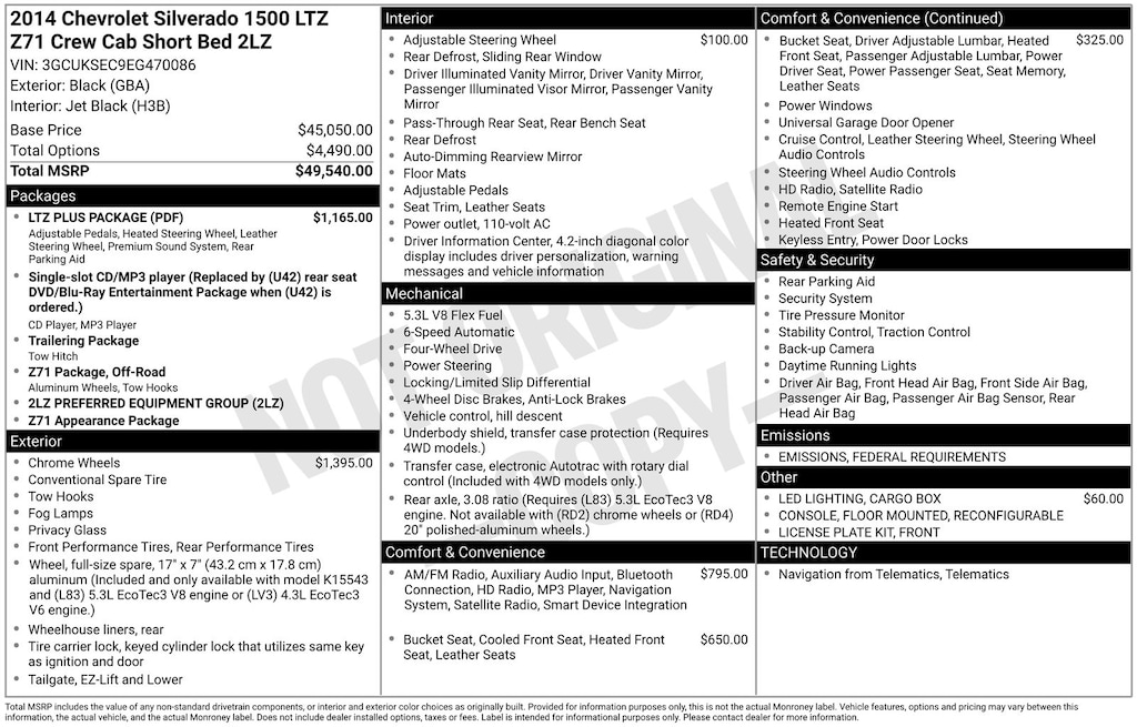 Black 2014 Chevrolet Silverado 1500 LTZ 2LZ 4WD 6-Speed Automatic Electronic with Overdrive EcoTec3 5.3L V8 Flex Fuel 6-Speed Automatic Electronic with Overdrive, 4WD, Jet Black Leather, Leather Wrapped Heated Steering Wheel, LTZ Plus Package, Power Adjustable Pedals, Trailering Equipment.