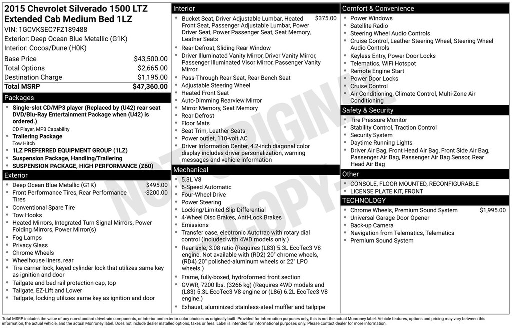 Deep Ocean Blue Metallic 2015 Chevrolet Silverado 1500 LTZ 1LZ 4WD 6-Speed Automatic Electronic with Overdrive EcoTec3 5.3L V8 6-Speed Automatic Electronic with Overdrive, 4WD, Cocoa/Dune Leather.