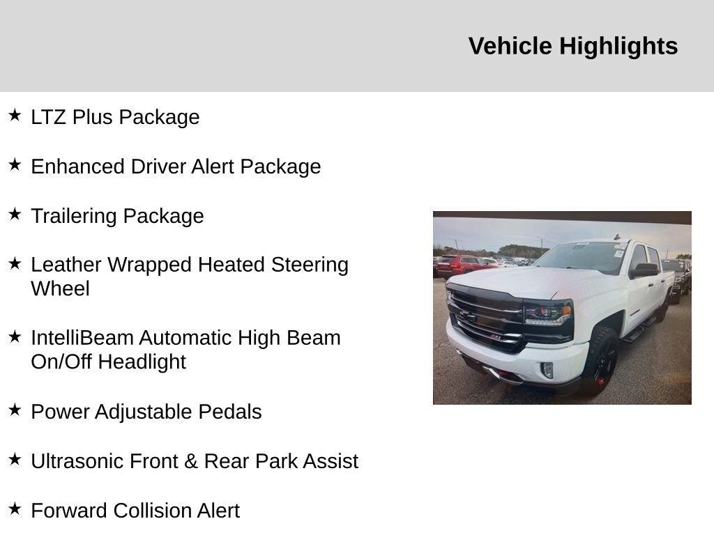 Enhanced Driver Alert Package (Forward Collision Alert, IntelliBeam Automatic High Beam On/Off Headlight, Lane Keep Assist, Low Speed Forward Automatic Braking, and Ultrasonic Front & Rear Park Assist), LTZ Plus Package (Leather Wrapped Heated Steering Wheel and Power Adjustable Pedals), Trailering Package, 8-Speed Automatic with Overdrive, 4WD, Jet Black Leather, 110-Volt AC Power Outlet, 150 Amp Alternator, 4-Wheel Disc Brakes, 4.2" Diagonal Color Display Driver Info Center, 40/20/40 Front Split Bench Seat, 6 Speaker Audio System, 6 Speakers, ABS brakes, Active Noise Cancellation, Air Conditioning, Alloy wheels, AM/FM radio: SiriusXM, Auto-dimming door mirrors, Auto-Dimming Inside Rear-View Mirror, Auto-dimming Rear-View mirror, Automatic temperature control, Auxiliary External Transmission Oil Cooler, Bluetooth® For Phone, Bodyside moldings, Bose Speaker System, Brake assist, CD player, Chrome Bodyside Moldings, Chrome Cap Power-Adjustable Heated Outside Mirrors, Chrome Door Handles, Chrome Mirror Caps, Color-Keyed Carpeting w/Rubberized Vinyl Floor Mats, Compass, Deep-Tinted Glass, Delay-off headlights, Driver & Front Passenger Illuminated Vanity Mirrors, Driver door bin, Driver vanity mirror, Dual front impact airbags, Dual front side impact airbags, Dual-Zone Automatic Climate Control, Electric Rear-Window Defogger, Electronic Stability Control, Emergency communication system: OnStar Guidance, Exterior Parking Camera Rear, EZ Lift & Lower Tailgate, Floor Mounted Console, Front anti-roll bar, Front Center Armrest w/Storage, Front Chrome Bumper, Front dual zone A/C, Front fog lights, Front Frame-Mounted Black Recovery Hooks, Front Full Feature Power Reclining Bucket Seats, Front License Plate Kit, Front reading lights, Front wheel independent suspension, Fully automatic headlights, Garage door transmitter, HD Radio, Heated & Vented Front Seating, Heated door mirrors, Heated Driver & Front Passenger Seats, Heated front seats, Heavy-Duty Rear Locking Differential, Illuminated entry, Integrated Trailer Brake Controller, Leather Appointed Seat Trim, Leather Wrapped Steering Wheel w/Cruise Controls, LED Cargo Box Lighting, LED Taillamps w/Signature, Low tire pressure warning, Manual Tilt/Telescoping Steering Column, Memory seat, Occupant sensing airbag, OnStar 3 Months Guidance Plan, OnStar w/4G LTE, Outside temperature display, Overhead airbag, Overhead console, Panic alarm, Passenger door bin, Passenger vanity mirror, Power door mirrors, Power driver seat, Power passenger seat, Power Sliding Rear Window, Power steering, Power windows, Power Windows w/Driver Express Up, Premium audio system: Chevrolet MyLink, Radio data system, Radio: AM/FM 8" Diagonal Clr Touch Nav, Radio: AM/FM 8" Diagonal Color Touch Screen, Rear 60/40 Folding Bench Seat (Folds Up), Rear Chrome Bumper, Rear reading lights, Rear seat center armrest, Rear step bumper, Rear Vision Camera, Rear Wheelhouse Liners, Rear window defroster, Remote Keyless Entry, Remote keyless entry, Remote Locking Tailgate, Remote Vehicle Starter System, Security system, Single Slot CD/MP3 Player, SiriusXM Satellite Radio, Speed control, Speed-sensing steering, Split folding rear seat, Spray-On Pickup Box Bed Liner, Steering Wheel Audio Controls, Steering wheel mounted audio controls, Tachometer, Telescoping steering wheel, Theft Deterrent System (Unauthorized Entry), Thin Profile LED Fog Lamps, Tilt steering wheel, Traction control, Trip computer, Turn signal indicator mirrors, Universal Home Remote, Variably intermittent wipers, Voltmeter, and Wireless Charging. Recent Arrival!