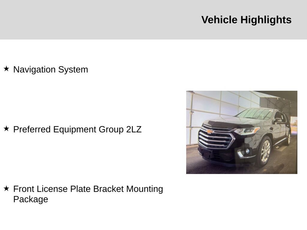 Front License Plate Bracket Mounting Package, Preferred Equipment Group 2LZ, AWD, Navigation System, 10 Speakers, 20" Polished Aluminum Wheels, 3.49 Axle Ratio, 3rd row seats: split-bench, 4-Wheel Disc Brakes, 7-Passenger Seating (2-2-3 Seating Configuration), ABS brakes, Air Conditioning, Alloy wheels, AM/FM radio: SiriusXM, Apple CarPlay/Android Auto, Auto High-beam Headlights, Auto-dimming door mirrors, Auto-dimming Rear-View mirror, Automatic temperature control, Bose Premium 10-Speaker Audio System Feature, Brake assist, Bumpers: body-color, Compass, Delay-off headlights, Driver door bin, Driver vanity mirror, Dual front impact airbags, Dual front side impact airbags, Electronic Stability Control, Emergency communication system: OnStar Guidance, Four wheel independent suspension, Front anti-roll bar, Front Bucket Seats, Front Center Armrest, Front dual zone A/C, Front fog lights, Front reading lights, Fully automatic headlights, Garage door transmitter, Heated door mirrors, Heated front seats, Heated rear seats, Heated steering wheel, Illuminated entry, Low tire pressure warning, Memory seat, Occupant sensing airbag, Outside temperature display, Overhead airbag, Overhead console, Panic alarm, Passenger door bin, Passenger vanity mirror, Perforated Leather-Appointed Seat Trim, Power door mirrors, Power driver seat, Power Liftgate, Power moonroof: Dual SkyScape, Power passenger seat, Power steering, Power windows, Premium audio system: Chevrolet MyLink, Radio data system, Radio: Chevrolet MyLink AM/FM Stereo w/Navigation, Rear air conditioning, Rear anti-roll bar, Rear reading lights, Rear window defroster, Rear window wiper, Remote keyless entry, Roof rack: rails only, Security system, SiriusXM Satellite Radio, Speed control, Speed-sensing steering, Spoiler, Steering wheel memory, Steering wheel mounted audio controls, Tachometer, Telescoping steering wheel, Tilt steering wheel, Traction control, Trip computer, Turn signal indicator mirrors, Variably intermittent wipers, Ventilated front seats, and Voltmeter. Recent Arrival!