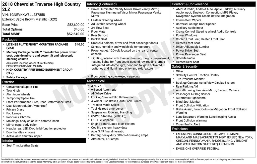 Sable Brown Metallic 2018 Chevrolet Traverse High Country AWD 9-Speed Automatic 3.6L V6 SIDI VVT AWD, Front License Plate Bracket Mounting Package, Navigation System, Preferred Equipment Group 2LZ.