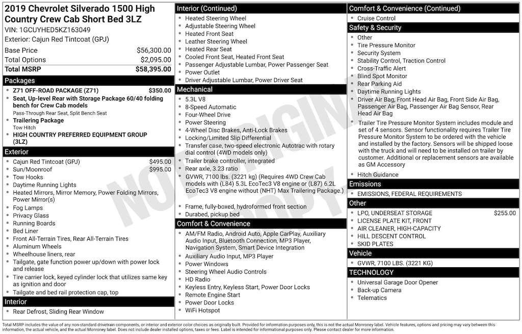 Cajun Red Tintcoat 2019 Chevrolet Silverado 1500 High Country 4WD 8-Speed Automatic EcoTec3 5.3L V8 8-Speed Automatic, 4WD, Jet Black Leather.