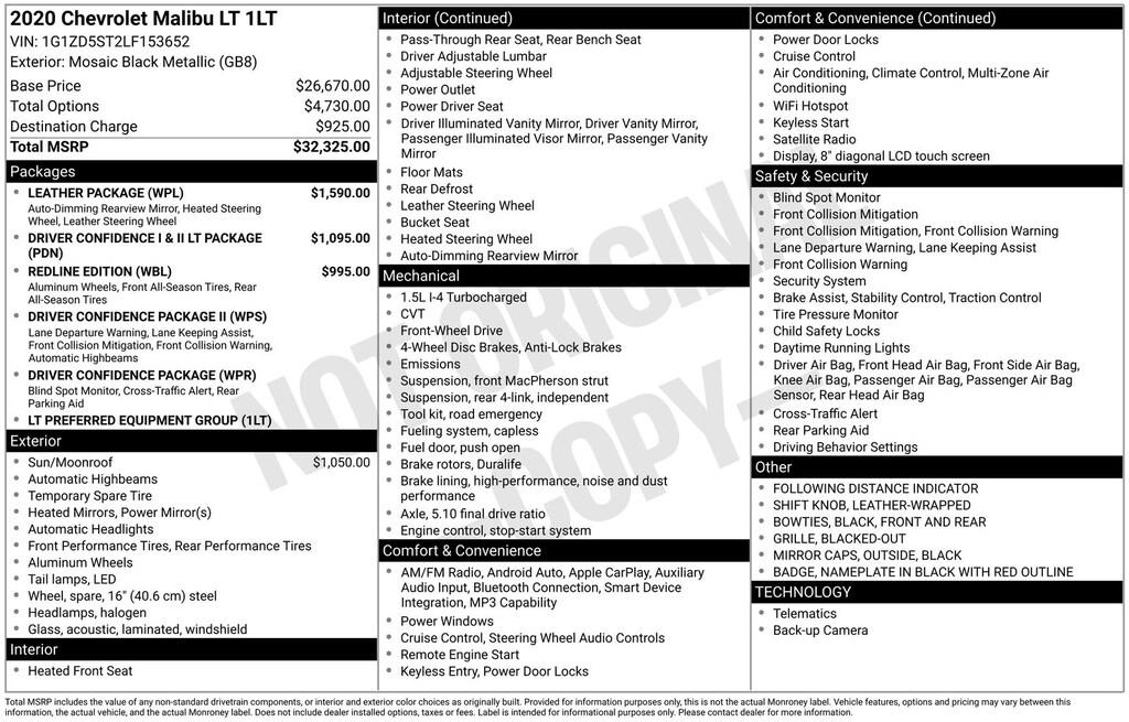 Driver Confidence I & II LT Package, Driver Confidence Package (Lane Change Alert w/Side Blind Zone Alert, Rear Cross Traffic Alert, and Rear Park Assist), Driver Confidence Package II (Automatic Emergency Braking, Following Distance Indicator, Forward Collision Alert, Front Pedestrian Braking, IntelliBeam Automatic High-Beam On/Off, and Lane Keep Assist w/Lane Departure Warning), Leather Package (3-Spoke Leather-Wrapped Steering Wheel, Heated Steering Wheel, Inside Rear-View Auto-Dimming Mirror, Leather-Appointed Seat Trim, and Leather-Wrapped Shift Knob), Preferred Equipment Group 1LT, Redline Edition (Black Outside Mirror Caps, Black w/Red Outline Nameplate Badge, Blacked-Out Grille, Front & Rear Black Bowties, and Wheels: 19" Black-Painted Alum w/Red Hash Marks), Black Leather, 17" Aluminum Wheels, 4-Wheel Disc Brakes, 6 Speakers, 6-Speaker Audio System Feature, 6-Way Manual Front Passenger Seat Adjuster, 8-Way Power Driver Seat Adjuster, ABS brakes, Air Conditioning, Alloy wheels, AM/FM radio: SiriusXM, Apple CarPlay/Android Auto, Automatic temperature control, Brake assist, Bumpers: body-color, Compass, Delay-off headlights, Driver door bin, Driver vanity mirror, Dual front impact airbags, Dual front side impact airbags, Electronic Stability Control, Emergency communication system: OnStar and Chevrolet connected services capable, Exterior Parking Camera Rear, Four wheel independent suspension, Front anti-roll bar, Front Bucket Seats, Front Center Armrest, Front dual zone A/C, Front reading lights, Fully automatic headlights, Heated door mirrors, Heated Driver & Front Passenger Seats, Heated front seats, Illuminated entry, Knee airbag, Low tire pressure warning, Occupant sensing airbag, Outside temperature display, Overhead airbag, Overhead console, Panic alarm, Passenger door bin, Passenger vanity mirror, Power door mirrors, Power Driver Lumbar Control Seat Adjuster, Power driver seat, Power steering, Power Tilt-Sliding Sunroof, Power windows, Premium audio system: Chevrolet Infotainment 3, Premium Cloth Seat Trim, Radio data system, Radio: Chevrolet Infotainment 3 System, Rear anti-roll bar, Rear reading lights, Rear seat center armrest, Rear side impact airbag, Rear window defroster, Remote keyless entry, Security system, SiriusXM Radio, Speed control, Split folding rear seat, Steering wheel mounted audio controls, Tachometer, Telescoping steering wheel, Tilt steering wheel, Traction control, Trip computer, Variably intermittent wipers, and Voltmeter. Recent Arrival! 29/36 City/Highway MPG