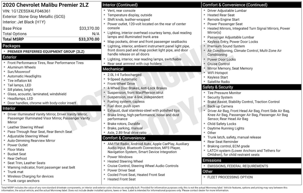 Stone Gray Metallic 2020 Chevrolet Malibu Premier FWD 9-Speed Automatic 2.0L 4-Cylinder DGI DOHC VVT Turbocharged Jet Black Leather, Navigation System, Preferred Equipment Group 2LZ.