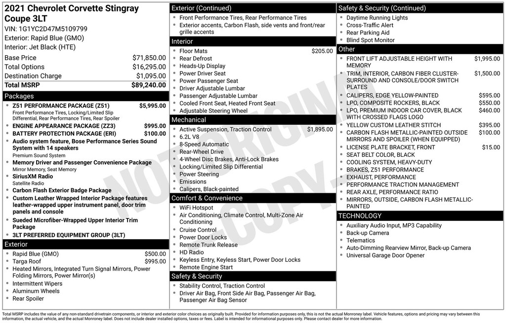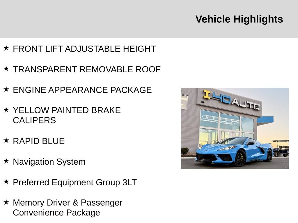 Battery Protection Package, Carbon Flash Metallic Painted Outside Mirrors (Carbon Flash Metallic-Painted Outside Mirrors), Custom Leather Wrapped Interior Package, Engine Appearance Package, Memory Driver & Passenger Convenience Package, Preferred Equipment Group 3LT (2 Cargo Nets, Driver Power Bolster Seat Adjuster, Electrical Theft Deterrent System, HD Front & Rear Vision Cameras, Head-Up Display, Heated & Vented Driver & Passenger Seats, Heated Steering Wheel, Passenger Power Bolster Seat Adjuster, Performance Data & Video Recorder, Power Driver Lumbar Control Seat Adjuster, Power Passenger Lumbar Control Seat Adjuster, Power-Adjustable Outside Heated Mirrors, Rear Camera Mirror, Rear Cross Traffic Alert, Side Blind Zone Alert, Sueded Microfiber-Wrapped Upper Interior Trim Pkg, Universal Home Remote, Vehicle Inclination Theft Deterrent Sensor, Vehicle Interior Movement Theft Deterrent Sensor, and Wireless Charging for Devices), Z51 Performance Package (Electronic Limited-Slip Differential, Heavy-Duty Cooling System, Performance Exhaust w/Stainless-Steel Tips, Performance Rear Axle Ratio, Rear Z51 Spoiler, Z51 Performance Brakes, and Z51 Performance Suspension), 14 Speakers, 4-Wheel Disc Brakes, 8-Way Power Driver Seat Adjuster, 8-Way Power Passenger Seat Adjuster, ABS brakes, Air Conditioning, All-Weather Floor Liners w/Jake Logo (LPO), Alloy wheels, AM/FM radio: SiriusXM, Auto-dimming door mirrors, Auto-dimming Rear-View mirror, Automatic temperature control, Black Composite Rockers (LPO), Black Premium Indoor Car Cover (LPO), Body-Color Removeable Roof Panel, Bose Performance Series Sound System w/14 Speakers, Brake assist, Bumpers: body-color, Carbon Fiber Interior Trim, Compass, Delay-off headlights, Driver door bin, Driver vanity mirror, Dual front impact airbags, Dual front side impact airbags, Edge Yellow-Painted Calipers, Electronic Stability Control, Emergency communication system: OnStar and Chevrolet connected services capable, Four wheel independent suspension, Front anti-roll bar, Front Bucket Seats, Front Center Armrest, Front dual zone A/C, Front License Plate Bracket, Front Lift Adjustable Height w/Memory, Front reading lights, Fully automatic headlights, Garage door transmitter, GT2 Bucket Seats, HD Radio, Heads-Up Display, Heated door mirrors, Heated front seats, Heated steering wheel, Illuminated entry, Leather Shift Knob, Leather steering wheel, Low tire pressure warning, Memory seat, Napa Lthr Seating Surfaces w/Perforated Inserts, Navigation System, Occupant sensing airbag, Outside temperature display, Overhead console, Panic alarm, Passenger door bin, Passenger vanity mirror, Performance Traction Management, Power door mirrors, Power driver seat, Power passenger seat, Power steering, Power windows, Radio data system, Radio: Chevrolet Infotainment 3 Premium System, Rear anti-roll bar, Rear Parking Sensors, Rear window defroster, Remote keyless entry, Security system, SiriusXM Radio, Speed control, Speed-sensing steering, Sport steering wheel, Steering wheel memory, Steering wheel mounted audio controls, Tachometer, Telescoping steering wheel, Tilt steering wheel, Traction control, Transparent Removable Roof Panel, Trip computer, Turn signal indicator mirrors, Variably intermittent wipers, Ventilated front seats, Voltmeter, Wheels: 19" x 8.5" Fr/20" x 11" Rr Bright Silver, Wireless Apple CarPlay/Wireless Android Auto, Yellow Custom Leather Stitch, and Z51 Perf Suspension w/Magnetic Selective Ride Cntrl. Recent Arrival! 15/27 City/Highway MPG
