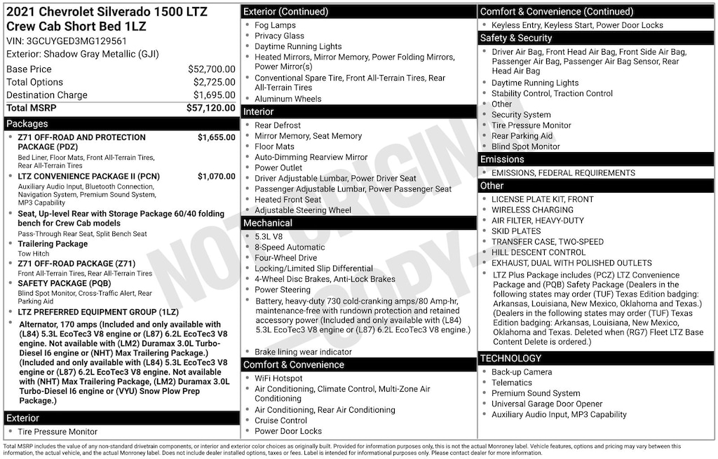LTZ Convenience Package (2 USB Ports (First Row), Floor Mounted Center Console, Power Sliding Rear Window w/Rear Defogger, Universal Home Remote, and Ventilated Driver & Front Passenger Seats), LTZ Convenience Package II (Premium Bose 7-Speaker Sound System, Radio: Chevrolet Infotainment 3 Premium System, and Wireless Charging), LTZ Plus Package, Preferred Equipment Group 1LZ (10-Way Power Driver Seat w/Lumbar, 10-Way Power Passenger Seat Adjuster w/Lumbar, 12-Volt Rear Auxiliary Power Outlet, 120-Volt Bed Mounted Power Outlet, 120-Volt Instrument Panel Power Outlet, 2 USB Ports, 4.2" Diagonal Color Display Driver Info Center, 4G LTE Wi-Fi Hot Spot Capable, 6-Speaker Audio System, Advanced Trailering System, Auto-Dimming Inside Rear-View Mirror, Auto-Locking Rear Differential, Auxiliary External Transmission Oil Cooler, Bluetooth® For Phone, Chevrolet Connected Access Capable, Chrome Grille, Chrome Mirror Caps, Color-Keyed Carpeting Floor Covering, Compass, Deep-Tinted Glass, Driver Memory, Electric Rear-Window Defogger, Electrical Lock Control Steering Column, Electronic Cruise Control, Front Frame-Mounted Black Recovery Hooks, Front LED Fog Lamps, Front Rubberized Vinyl Floor Mats, HD Rear Vision Camera, Heated Driver & Front Outboard Passenger Seats, Heated Steering Wheel, Hitch Guidance w/Hitch View, Integrated Trailer Brake Controller, Keyless Open & Start, Leather Wrapped Steering Wheel, LED Cargo Area Lighting, Manual Tilt/Telescoping Steering Column, OnStar & Chevrolet Connected Services Capable, Outside Heated Power-Adjustable Mirrors, Power Door Locks, Power Front Passenger Windows w/Express Up/Down, Power Front Windows w/Driver Express Up/Down, Power Rear Windows w/Express Down, Power Tailgate, Rear Dual USB Charging-Only Ports, Rear Rubberized-Vinyl Floor Mats, Rear Wheelhouse Liners, Remote Vehicle Starter System, SiriusXM w/360L, Standard Tailgate, Steering Wheel Audio Controls, Theft Deterrent System (Unauthorized Entry), and Wireless Phone Projection), Safety Package (Lane Change Alert w/Side Blind Zone Alert, Perimeter Lighting, Rear Cross Traffic Alert, and Ultrasonic Front & Rear Park Assist), Trailering Package (Hitch Guidance), Up-Level Rear Seat w/Storage Package, Z71 Off-Road & Protection Package (All-Weather Floor Liner (LPO) (AAK) and Chevytec Spray-On Black Bedliner), Z71 Off-Road Package (Dual Exhaust w/Polished Outlets, Heavy-Duty Air Filter, Hill Descent Control, and Off-Road Suspension), 8-Speed Automatic, 4WD, Jet Black Leather, 170 Amp Alternator, 2nd Row Heated Outboard Seats, 3.23 Rear Axle Ratio, 4-Wheel Disc Brakes, 6 Speakers, ABS brakes, Air Conditioning, Alloy wheels, AM/FM radio: SiriusXM with 360L, Apple CarPlay/Android Auto, Auto-dimming door mirrors, Auto-dimming Rear-View mirror, Automatic temperature control, Brake assist, Bumpers: chrome, Delay-off headlights, Driver door bin, Driver vanity mirror, Dual front impact airbags, Dual front side impact airbags, Electronic Stability Control, Front anti-roll bar, Front Bucket Seats, Front Center Armrest w/Storage, Front dual zone A/C, Front fog lights, Front License Plate Kit, Front reading lights, Front wheel independent suspension, Fully automatic headlights, Garage door transmitter, Heated door mirrors, Heated front seats, Heated steering wheel, Heavy Duty Suspension, Illuminated entry, Low tire pressure warning, Memory seat, Occupant sensing airbag, Outside temperature display, Overhead airbag, Overhead console, Panic alarm, Passenger door bin, Passenger vanity mirror, Perforated Leather-Appointed Front Seat Trim, Power door mirrors, Power driver seat, Power passenger seat, Power steering, Power windows, Premium audio system: Chevrolet Infotainment 3 Plus, Radio data system, Radio: Chevrolet Infotainment 3 Plus System, Rear reading lights, Rear seat center armrest, Rear step bumper, Rear windo