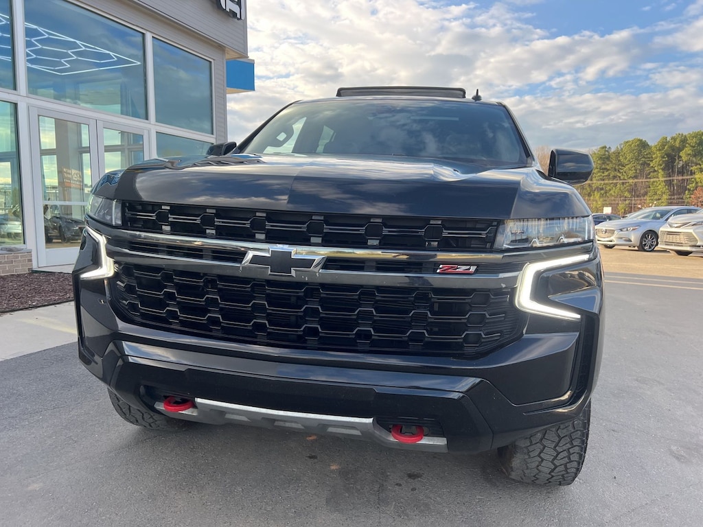 Preferred Equipment Group 2Z7 (1st & 2nd Row Color-Keyed Carpeted Floor Mats, 2 USB Data Ports, 2-Speed Active Electronic AutoTrac Transfer Case, Auto-Dimming Inside Rear-View Mirror, Black Tubular Assist Steps, Bright Front & Rear Door Sill Plates, Color-Keyed Carpeting Floor Covering, Driver & Front Outboard Passenger Airbags, Floor Console w/Storage Area, Front High-Approach Angle Fascia, Hands-Free Rear Power Programmable Liftgate, HD Radio, Hill Descent Control, Infotainment Display, Leather-Wrapped Steering Wheel, LED Daytime Running Lamps, Memory Settings for Driver, Red Horizontal-Mounted Recovery Hooks, Remote Start, SiriusXM Radio w/360L, and Universal Home Remote), 4WD, Black Leather, 10-Way Power Driver & Passenger Seat Adjusters, 3.23 Rear Axle Ratio, 3rd row seats: split-bench, 4-Wheel Disc Brakes, 9 Speakers, ABS brakes, Air Conditioning, Alloy wheels, AM/FM radio: SiriusXM with 360L, Apple CarPlay/Android Auto, Auto High-beam Headlights, Auto-dimming Rear-View mirror, Automatic temperature control, Bose 9-Speaker Stereo Audio System Feature, Brake assist, Bumpers: body-color, Compass, Delay-off headlights, Driver door bin, Driver vanity mirror, Dual front impact airbags, Dual front side impact airbags, Dual-Pane Power Panoramic Sunroof, Electronic Stability Control, Emergency communication system: OnStar and Chevrolet connected services capable, Four wheel independent suspension, Front anti-roll bar, Front Bucket Seats, Front Center Armrest, Front dual zone A/C, Front High-Back Reclining Bucket Seats, Front reading lights, Fully automatic headlights, Garage door transmitter, Heated door mirrors, Heated Driver & Front Passenger Seats, Heated front seats, Illuminated entry, Leather Seat Trim, Leather steering wheel, Low tire pressure warning, Memory seat, Occupant sensing airbag, Outside temperature display, Overhead airbag, Overhead console, Panic alarm, Passenger door bin, Passenger vanity mirror, Power door mirrors, Power driver seat, Power Liftgate, Power passenger seat, Power steering, Power windows, Premium audio system: Chevrolet Infotainment 3, Premium Smooth Ride Suspension, Radio: Chevrolet Infotainment 3 Plus System, Rain sensing wipers, Rear air conditioning, Rear anti-roll bar, Rear reading lights, Rear seat center armrest, Rear window defroster, Rear window wiper, Remote keyless entry, Roof rack: rails only, Security system, Speed control, Speed-sensing steering, Split folding rear seat, Spoiler, Steering wheel mounted audio controls, Tachometer, Telescoping steering wheel, Tilt steering wheel, Traction control, Trip computer, Variably intermittent wipers, Voltmeter, and Wheels: 20" x 9" Machined Aluminum. Recent Arrival!
