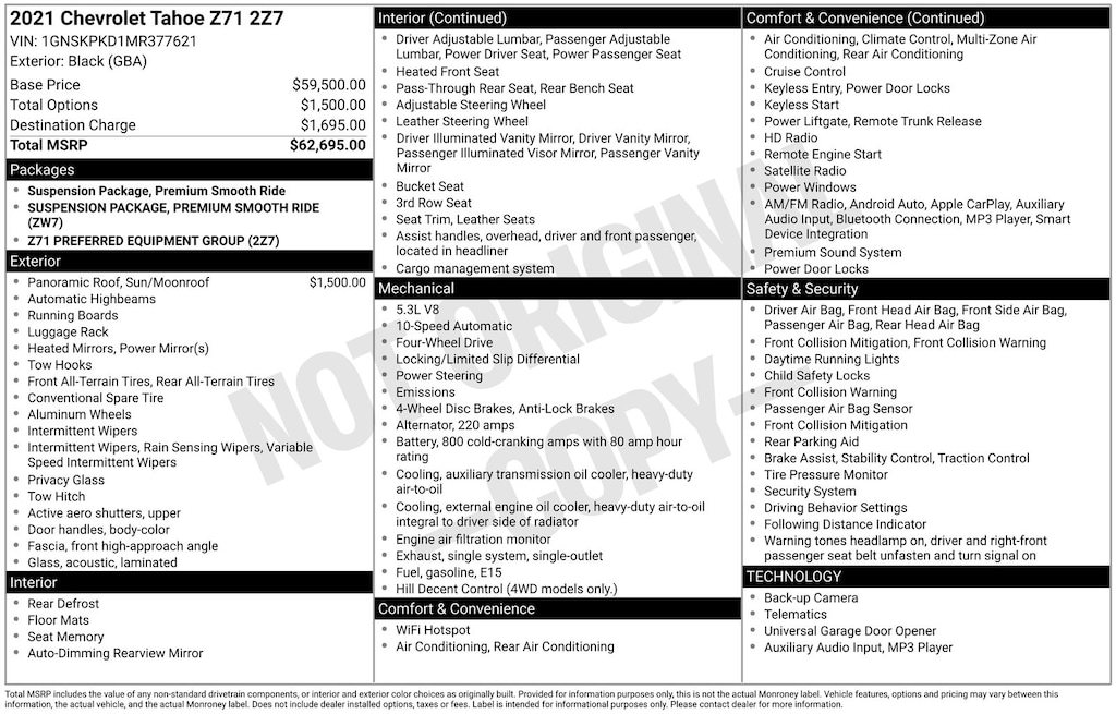 Black 2021 Chevrolet Tahoe Z71 4WD 10-Speed Automatic with Overdrive EcoTec3 5.3L V8 4WD, Black Leather.