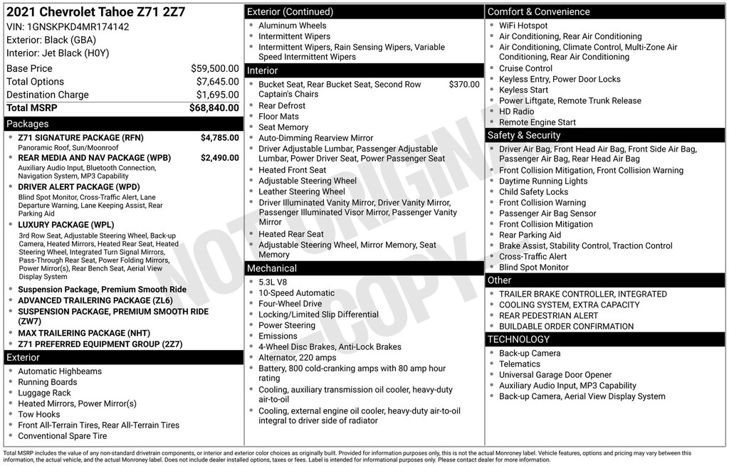 Black 2021 Chevrolet Tahoe Z71 4WD 10-Speed Automatic with Overdrive EcoTec3 5.3L V8 4WD, Black Leather.