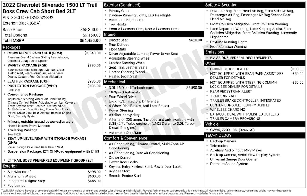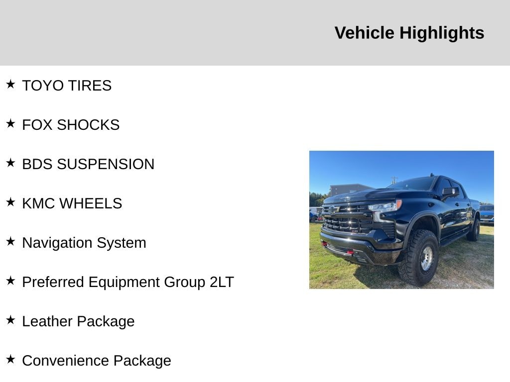 Convenience Package (10-Way Power Driver Seat w/Lumbar, 120-Volt Bed Mounted Power Outlet, 120-Volt Instrument Panel Power Outlet, Dual Rear USB Ports (Charge Only), Dual-Zone Automatic Climate Control, Electric Rear-Window Defogger, Heated Driver & Front Outboard Passenger Seats, Heated Steering Wheel, Keyless Open & Start, Leather Wrapped Steering Wheel, Manual Tilt/Telescoping Steering Column, Remote Vehicle Starter System, and Theft Deterrent System (Unauthorized Entry)), Convenience Package II (Hitch Guidance w/Hitch View, Integrated Trailer Brake Controller, Power Sliding Rear Window w/Rear Defogger, Premium Bose 7-Speaker Sound System, Trailering App, and Universal Home Remote), Leather Package (Leather-Appointed Front Seat Trim), Preferred Equipment Group 2LT (12.3" Multicolor Reconfigurable Digital Display, 6-Speaker Audio System, All-Weather Floor Liner (LPO) (AAK), Auto-Locking Rear Differential, Bluetooth® For Phone, Chevrolet Connected Access Capable, Color-Keyed Carpeting Floor Covering, Compass, Deep-Tinted Glass, Electrical Steering Column Lock, Electronic Cruise Control, EZ Lift Power Lock & Release Tailgate, Front LED Fog Lamps, HD Rear Vision Camera, Heated Power-Adjustable Outside Mirrors, High Gloss Black Mirror Caps, Inside Rear-View Mirror w/Tilt, LED Cargo Area Lighting, OnStar & Chevrolet Connected Services Capable, Performance Red Recovery Hooks, Power Front Windows w/Driver Express Up/Down, Power Front Windows w/Passenger Express Down, Power Rear Windows w/Express Down, Rear 60/40 Folding Bench Seat (Folds Up), SiriusXM w/360L, Standard Tailgate, Steering Wheel Audio Controls, Wi-Fi Hot Spot Capable, and Wireless Phone Projection), Protection Package (Chevytec Spray-On Black Bedliner and Rear Wheelhouse Liners), Safety Package (HD Surround Vision, Perimeter Lighting, Rear Cross Traffic Alert-Braking, Rear Park Assist, Rear Pedestrian Detection, Trailer Camera Provisions, and Trailer Side Blind Zone Alert), Suspension Package (Heavy-Duty Air Filter and Hill Descent Control), Trailering Package (Hitch Guidance), Up-Level Rear Seat w/Storage Package, 10-Speed Automatic, 4WD, Black Leather, 2 USB Data Ports, 220 Amp Alternator, 4-Wheel Disc Brakes, 40/20/40 Front Split-Bench Seat, 6 Speakers, ABS brakes, Air Conditioning, Alloy wheels, AM/FM radio: SiriusXM with 360L, Apple CarPlay/Android Auto, Auto High-beam Headlights, Automatic Emergency Braking, Automatic temperature control, Brake assist, Cloth Seat Trim, Delay-off headlights, Driver door bin, Driver vanity mirror, Dual Exhaust w/Polished Outlets, Dual front impact airbags, Dual front side impact airbags, Electronic Stability Control, Electronic Transmission Range Selector Shifter, Engine Block Heater, Floor Mounted Center Console, Following Distance Indicator, Forward Collision Alert, Front anti-roll bar, Front Bucket Seats, Front Center Armrest w/Storage, Front dual zone A/C, Front fog lights, Front Pedestrian Braking, Front reading lights, Front wheel independent suspension, Fully automatic headlights, Heated door mirrors, Heated front seats, Heated steering wheel, Illuminated entry, IntelliBeam Automatic High Beam On/Off, Lane Keep Assist w/Lane Departure Warning, Low tire pressure warning, Multi-Flex Tailgate, Not Equipped w/Rear Park Assist, Not Equipped w/Steering Column Lock, Occupant sensing airbag, Outside temperature display, Overhead airbag, Overhead console, Panic alarm, Passenger door bin, Passenger vanity mirror, Power door mirrors, Power driver seat, Power steering, Power Sunroof, Power windows, Premium audio system: Chevrolet Infotainment 3 Premium, Radio data system, Radio: Chevrolet Infotainment 3 Premium System, Rear reading lights, Rear step bumper, Rear window defroster, Remote keyless entry, Security system, Speed control, Speed-sensing steering, Split folding rear seat, Steering wheel mounted audio
