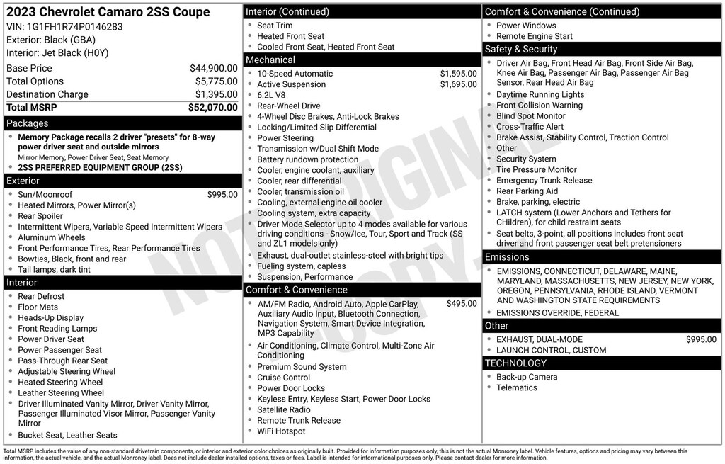 Preferred Equipment Group 2SS (Rear Park Assist), 2.77 Rear Axle Ratio, 4-Wheel Disc Brakes, 6-Way Power Front Passenger Seat Adjuster, 8-Way Power Driver Seat Adjuster, 9 Speakers, ABS brakes, Air Conditioning, Alloy wheels, AM/FM radio: SiriusXM with 360L, Apple CarPlay/Android Auto, Auto-dimming door mirrors, Automatic temperature control, Bluetooth® For Phone, Bose Premium 9-Speaker Audio System Feature, Brake assist, Bumpers: body-color, Compass, Custom Launch Control, Delay-off headlights, Driver door bin, Driver vanity mirror, Dual front impact airbags, Dual front side impact airbags, Dual Mode Exhaust, Electronic Stability Control, Exterior Parking Camera Rear, Four wheel independent suspension, Front anti-roll bar, Front Bucket Seats, Front Center Armrest, Front dual zone A/C, Front reading lights, Front Sport Bucket Seats, Fully automatic headlights, Heads-Up Display, Heated door mirrors, Heated Driver & Front Passenger Seats, Heated front seats, Heated steering wheel, Illuminated entry, Knee airbag, Leather Shift Knob, Leather-Trimmed Seat Trim, Low tire pressure warning, Magnetic Ride Control, Memory seat, Occupant sensing airbag, Outside temperature display, Overhead airbag, Paddle-Shift Manual Controls, Panic alarm, Passenger door bin, Passenger vanity mirror, Power door mirrors, Power driver seat, Power passenger seat, Power steering, Power Sunroof, Power windows, Premium audio system: Chevrolet Infotainment System, Radio data system, Radio: Chevrolet Infotainment 3 Plus System, Radio: Chevrolet Infotainment 3 Premium System, Rear anti-roll bar, Rear window defroster, Remote keyless entry, Remote Vehicle Starter System, Security system, SiriusXM w/360L, Speed control, Speed-sensing steering, Spoiler, Steering wheel mounted audio controls, Tachometer, Telescoping steering wheel, Tilt steering wheel, Traction control, Trip computer, Variably intermittent wipers, Ventilated Driver & Front Passenger Seats, Ventilated front seats, Voltmeter, and Wheels: 20" x 8.5" Fr & 20" x 9.5" Rr 5-Spoke Alum. Recent Arrival! 16/26 City/Highway MPG
