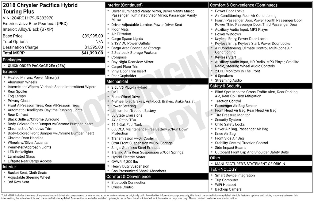Jazz Blue Pearlcoat 2018 Chrysler Pacifica Hybrid Touring Plus FWD CVT 3.6L V6 3.6L V6.