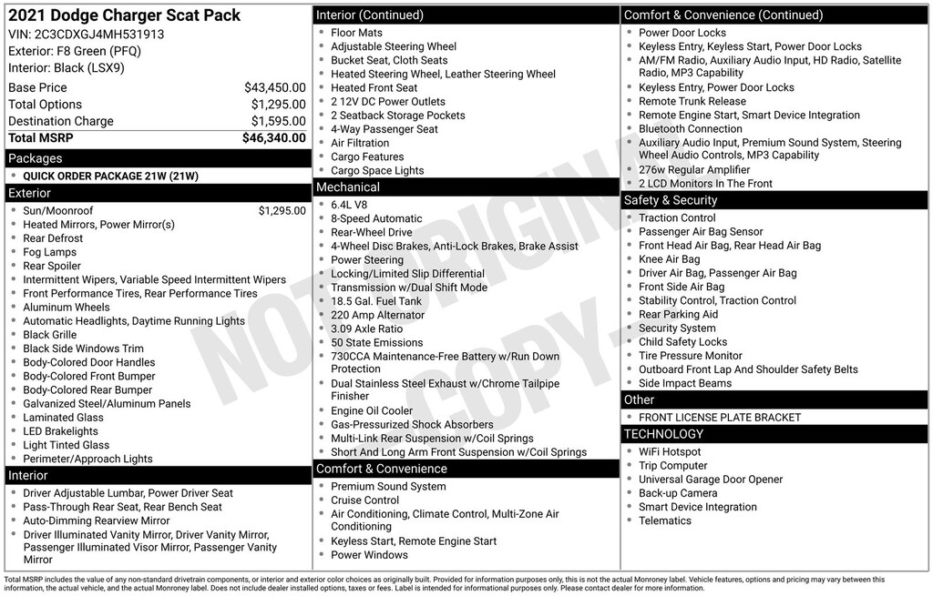 F8 Green 2021 Dodge Charger R/T Scat Pack RWD 8-Speed Automatic SRT HEMI 6.4L V8 MDS Black Cloth.
