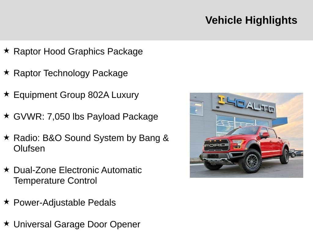 Equipment Group 802A Luxury (10-Way Power Driver & Passenger Seats, 360 Degree Camera, 4.10 Front Axle w/Torsen Differential, 8" Productivity Screen, Advanced Security Pack, Ambient Lighting - Ice Blue Color Only, BLIS Blind Spot Information System, Dual-Zone Electronic Automatic Temperature Control, Heated & Ventilated Leather 40/Console/40 Front Seats, Heated Steering Wheel, Inflatable Rear Safety Belts, Integrated Trailer Brake Controller, Intelligent Access w/Push-Button Start, LED Box Lighting, LED Sideview Mirror Spotlights, Memory System (Seat, Pedal, Exterior Mirror), Power Glass Heated Sideview Mirrors, Power Tilt/Telescoping Steering Column w/Memory, Power-Adjustable Pedals, Power-Sliding Rear Window, Pro Trailer Backup Assist, Radio: B&O Sound System by Bang & Olufsen, Remote Start System w/Remote Tailgate Release, SYNC 3, Tailgate Applique FORD, Universal Garage Door Opener, and Voice-Activated Touchscreen Navigation), GVWR: 7,050 lbs Payload Package, Raptor Hood Graphics Package, Raptor Technology Package (Adaptive Cruise Control w/Stop-and-Go, Lane Keeping System w/Alert & Assist, and Rain-Sensing Windshield Wipers), 4WD, 17" Cast Aluminum Wheels, 17" Forged Aluminum Bead-Lock Capable Wheels, 4-Wheel Disc Brakes, 7 Speakers, 8-Way Power Driver's Seat w/Power Lumbar, ABS brakes, Air Conditioning, Alloy wheels, AM/FM radio: SiriusXM, AppLink/Apple CarPlay and Android Auto, Auto High-beam Headlights, Auto-dimming Rear-View mirror, Brake assist, Compass, Delay-off headlights, Driver door bin, Driver vanity mirror, Dual front impact airbags, Dual front side impact airbags, Electronic Locking w/4.10 Axle Ratio, Electronic Stability Control, Emergency communication system: SYNC 3 911 Assist, Exterior Parking Camera Rear, Front anti-roll bar, Front Bucket Seats, Front Center Armrest, Front reading lights, Front wheel independent suspension, Fully automatic headlights, Heated Leather 40/Console/40 Front Seats, Illuminated entry, Leather steering wheel, Low tire pressure warning, Occupant sensing airbag, Outside temperature display, Overhead airbag, Overhead console, Panic alarm, Passenger door bin, Passenger vanity mirror, Power door mirrors, Power driver seat, Power steering, Power windows, Radio data system, Radio: SiriusXM w/7 Speakers, Rear Parking Sensors, Rear reading lights, Rear step bumper, Rear window defroster, Remote keyless entry, Remote Start System, Second-Row Heated Seats, Security system, Speed control, Speed-sensing steering, Split folding rear seat, Steering wheel mounted audio controls, Tachometer, Tailgate Step w/Tailgate Lift Assist, Telescoping steering wheel, Tilt steering wheel, Traction control, Trip computer, Twin Panel Moonroof, Unique Cloth Trim Seats, and Variably intermittent wipers. Recent A
