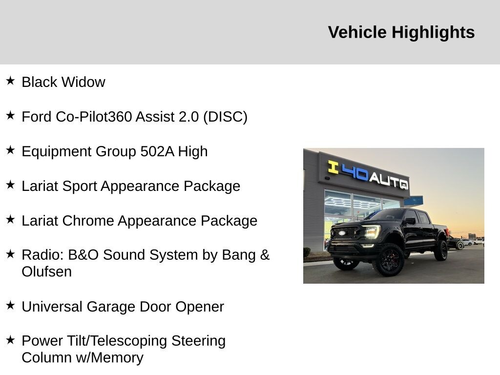 Equipment Group 502A High (Onboard 400W Outlet and Wireless Charging Pad), Ford Co-Pilot360 Assist 2.0 (DISC) (Connected Built-In Navigation, Evasive Steering Assist, Intelligent Adaptive Cruise Control w/Stop & Go, Intersection Assist, and Speed Sign Recognition), Lariat Sport Appearance Package (Accent-Color Angular Step Bars, Body-Color Front & Rear Bumpers, Box Side Decals, Chrome Single-Tip Exhaust, Dark 2-Bar & 1 Minor Bar Style Grille, and Wheels: 18" 6-Spoke Machined Aluminum), Trailer Tow Package (Class IV Trailer Hitch Receiver, Integrated Trailer Brake Controller, and Pro Trailer Backup Assist), 4WD, 18" Machined-Aluminum Wheels, 360 Degree Camera, 4-Wheel Disc Brakes, 7 Speakers, ABS brakes, Adjustable pedals, Air Conditioning, Alloy wheels, AM/FM radio: SiriusXM with 360L, Auto High-beam Headlights, Auto Start-Stop Removal, Auto-dimming door mirrors, Auto-dimming Rear-View mirror, Automatic temperature control, Brake assist, Bumpers: chrome, Compass, Delay-off headlights, Driver door bin, Driver vanity mirror, Dual front impact airbags, Dual front side impact airbags, Electronic Stability Control, Emergency communication system: SYNC 4 911 Assist, Extended Range 36 Gallon Fuel Tank, Exterior Parking Camera Rear, Front anti-roll bar, Front Center Armrest w/Storage, Front dual zone A/C, Front fog lights, Front reading lights, Front wheel independent suspension, Fully automatic headlights, Heated door mirrors, Heated front seats, Illuminated entry, Leather-Trimmed 40/20/40 Front Seat, LED Sideview Mirror Spotlights, Low tire pressure warning, Memory seat, Occupant sensing airbag, Outside temperature display, Overhead airbag, Overhead console, Panic alarm, Passenger door bin, Passenger vanity mirror, Pedal memory, Power door mirrors, Power driver seat, Power passenger seat, Power steering, Power windows, Radio data system, Radio: AM/FM SiriusXM w/360L, Radio: B&O Unleashed Sound System by Bang & Olufsen, Rear reading lights, Rear seat center armrest, Rear step bumper, Rear window defroster, Remote keyless entry, Security system, Speed control, Speed-sensing steering, Split folding rear seat, Steering wheel mounted audio controls, SYNC 4 w/Enhanced Voice Recognition, Tachometer, Telescoping steering wheel, Tilt steering wheel, Traction control, Trip computer, Turn signal indicator mirrors, Twin Panel Moonroof, Variably intermittent wipers, Ventilated front seats, Voltmeter, and Wheel Well Liner. Recent Arrival!