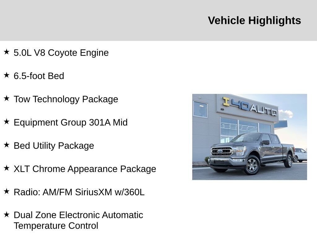Gray Metallic 2022 Ford F-150 XLT 4WD 10-Speed Automatic 5.0L V8 5.0L V8 Coyote Engine, 6.5-foot Bed, 4WD, 2-Bar Style Grille w/Chrome 2 Minor Bars, 360 Degree Camera, 8-Way Power Driver's Seat w/Power Lumbar, 8" Productivity Screen in Instrument Cluster, Auto-Dimming Rear-View Mirror, Bed Utility Package, BoxLink, Bright Polished Step Bars, Chrome Door & Tailgate Handles w/Body-Color Bezel, Chrome Single-Tip Exhaust, Class IV Trailer Hitch Receiver, Dual Zone Electronic Automatic Temperature Control, Equipment Group 301A Mid, Integrated Trailer Brake Controller, Leather-Wrapped Steering Wheel, LED Box Lighting, Pro Trailer Backup Assist, Radio: AM/FM SiriusXM w/360L, Rear Under-Seat Storage, SecuriCode Drivers Side Keyless-Entry Keypad, SYNC 4 w/Enhanced Voice Recognition, Tailgate Step w/Tailgate Work Surface, Tow Technology Package, Wheels: 18" Chrome-Like PVD, XLT Chrome Appearance Package, Zone Lighting.