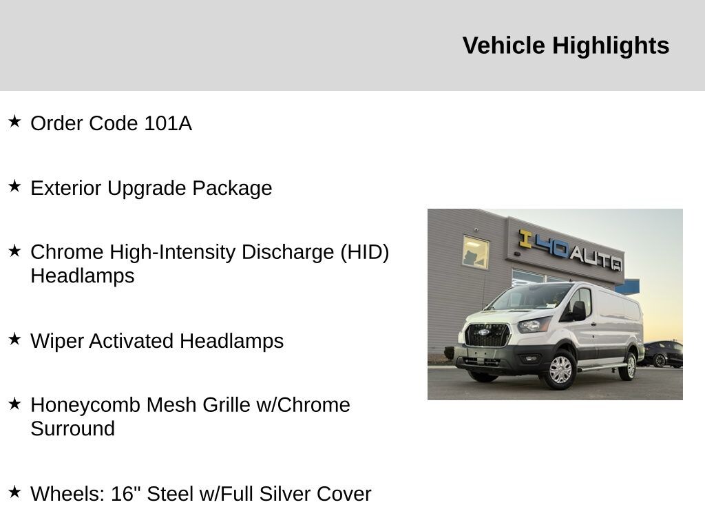 Exterior Upgrade Package (Chrome High-Intensity Discharge (HID) Headlamps, Honeycomb Mesh Grille w/Chrome Surround, Wheels: 16" Steel w/Full Silver Cover, and Wiper Activated Headlamps), Order Code 101A, 2 Additional Keys (4 Total), 3.73 Axle Ratio, 4 Speakers, 4-Wheel Disc Brakes, 6 Cargo Tie-Down Hooks, ABS brakes, Air Conditioning, AM/FM radio, AM/FM Stereo, Auto High-beam Headlights, Auto Start-Stop Delete, Brake assist, Cruise Control w/Adjustable Spd Limiting Device (ASLD), Dark Palazzo Gray Vinyl Bucket Seats, Delay-off headlights, Driver door bin, Driver's Seat Mounted Armrest, Dual front impact airbags, Dual front side impact airbags, Ebony Cloth Bucket Seats w/Armrests, Electronic Stability Control, Exterior Parking Camera Rear, Fixed Rr Cargo Door & 2nd Row Passenger-Side Glass, Front anti-roll bar, Front Bucket Seats, Front Fog Lamps, Front License Plate Bracket, Front reading lights, Front wheel independent suspension, Fully automatic headlights, Illuminated entry, Low tire pressure warning, Occupant sensing airbag, Overhead airbag, Panic alarm, Passenger cancellable airbag, Passenger door bin, Passenger-Side B-Pillar Assist Handle, Power door mirrors, Power steering, Power windows, Radio: AM/FM Stereo w/SYNC 3, Rear-Window Defroster, Rearview Mirror, Remote keyless entry, Short-Arm Manual-Folding Power Adjust Mirrors, Steering wheel mounted audio controls, Tachometer, Telescoping steering wheel, Tilt steering wheel, Traction control, Variably intermittent wipers, Vinyl Front Bucket Seats, Wheels: 16" Silver Steel w/Black Hubcap, and Wi-Fi 4G LTE Hotspot Delete. Recent Arrival!