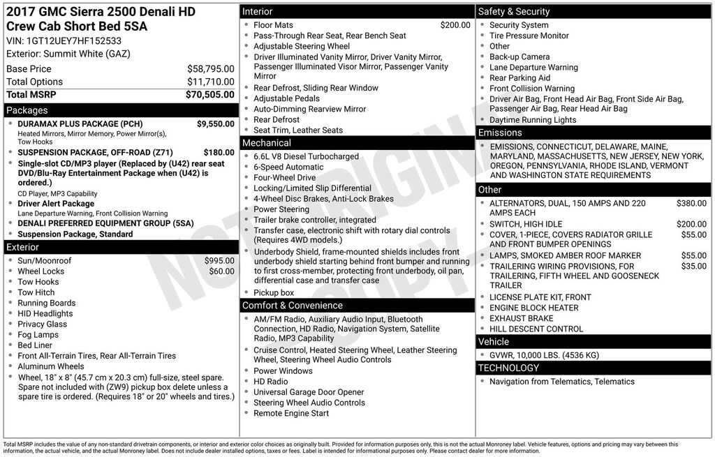 Driver Alert Package (Forward Collision Alert, Lane Departure Warning System, and Ultrasonic Front & Rear Park Assist), Duramax Plus Package (Chrome Power-Adjustable Heated Outside Mirrors and Chrome Recovery Hooks), Heavy-Duty Handling/Trailering Suspension Package, Off-Road Package (Hill Descent Control and Z71 Chrome Front Fender Emblems), Trailering Equipment (Trailer Brake Controller), Allison 1000 6-Speed Automatic, 4WD, Jet Black Leather, 1-Piece Radiator Grille/Front Bumper Opening Cover, 110-Volt AC Power Outlet, 150 Amps Alternator, 3.73 Rear Axle Ratio, 4-Wheel Disc Brakes, 4.10 Rear Axle Ratio, 7 Speakers, 8" Multi-Color Driver Instrument Info Display, ABS brakes, Adjustable pedals, Air Conditioning, All-Weather Floor Liner (LPO), Alloy wheels, AM/FM radio: SiriusXM, Apple CarPlay/Android Auto, Auto-dimming door mirrors, Auto-Dimming Inside Rear-View Mirror, Auto-dimming Rear-View mirror, Automatic temperature control, Black Frame-Mounted Front Recovery Hooks, Bluetooth® For Phone, Body-Color Front Bumper, Bodyside moldings, Bose 7 Speaker Sound System, Brake assist, Bumpers: body-color, Camper & 5th Wheel Trailer Wiring Provisions, CD player, Chrome Bodyside Moldings, Chrome Door Handles, Chrome wheels, Color-Keyed Carpeted Floor Mats, Color-Keyed Carpeting Floor Covering, Compass, Deep-Tinted Glass, Delay-off headlights, Denali Decor, Driver & Front Passenger Vanity Mirror Visors, Driver door bin, Driver vanity mirror, Dual 150 Amps & 220 Amps Each Alternator, Dual front impact airbags, Dual front side impact airbags, Dual-Zone Automatic Climate Control, Electric Rear-Window Defogger, Electronic Shift Transfer Case, Electronic Stability Control, Emergency communication system: OnStar Guidance, Engine Block Heater, Exhaust Brake, Exterior Parking Camera Rear, EZ-Lift & Lower Tailgate, Floor Mounted Console, Front anti-roll bar, Front Center Armrest, Front dual zone A/C, Front fog lights, Front Full Feature Ventilated Bucket Seats, Front License Plate Kit, Front reading lights, Front wheel independent suspension, Fully automatic headlights, Garage door transmitter, HD Radio, Heated & Ventilated Front Bucket Seats, Heated door mirrors, Heated Driver and Front Passenger Seats, Heated front seats, Heated Leather Wrapped Steering Wheel, Heated Power-Adjustable Outside Mirrors, Heated steering wheel, High Idle Switch, High-Intensity Discharge Headlights, Illuminated entry, Low tire pressure warning, Manual Tilt-Wheel/Telescoping Steering Column, Memory seat, Navigation System, Occupant sensing airbag, OnStar Guidance Plan For 3 Months, OnStar w/4G LTE, Outside temperature display, Overhead airbag, Overhead console, Panic alarm, Passenger door bin, Passenger vanity mirror, Perforated Leather Appointed Seat Trim, Power door mirrors, Power driver seat, Power passenger seat, Power Sliding Rear Window w/Defogger, Power steering, Power Sunroof, Power windows, Power Windows w/Driver Express Up & Down, Power-Adjustable Pedals For Accelerator & Brake, Premium audio system: IntelliLink, Radio: AM/FM/SiriusXM/HD w/Navigation, Rear 60/40 Folding Bench Seat (Folds Up), Rear Body-Color Bumper w/Bumper CornerSteps, Rear reading lights, Rear seat center armrest, Rear step bumper, Rear Vision Camera, Rear Wheelhouse Liners, Rear window defroster, Remote Keyless Entry, Remote keyless entry, Remote Locking Tailgate, Remote Vehicle Starter System, Security system, Single Slot CD/MP3 Player, SiriusXM Satellite Radio, Smoked Amber Roof Marker Lamps, Speed control, Speed-sensing steering, Split folding rear seat, Steering Wheel Audio Controls, Steering wheel mounted audio controls, Tachometer, Telescoping steering wheel, Theft Deterrent System (Unauthorized Entry), Tilt steering wheel, Traction control, Trip computer, Turn signal indicator mirrors, Universal Home Remote, Vari