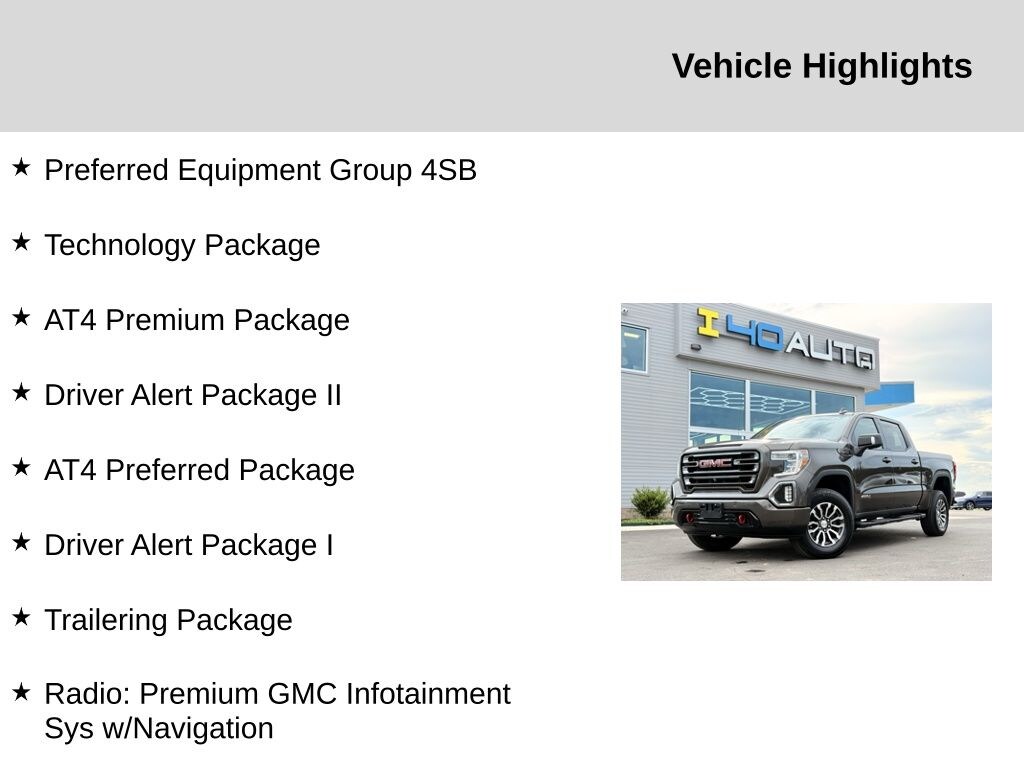 AT4 Preferred Package (Power Sliding Rear Window w/Rear Defogger, Premium Bose 7-Speaker Sound System, Radio: Premium GMC Infotainment Sys w/Navigation, SiriusXM Radio, Universal Home Remote, and Wireless Charging), AT4 Premium Package (Trailer Tire Pressure Monitor System), Driver Alert Package I (Lane Change Alert w/Side Blind Zone Alert, Perimeter Lighting, Rear Cross Traffic Alert, and Ultrasonic Front & Rear Park Assist), Driver Alert Package II (Following Distance Indicator, Forward Collision Alert, Front Pedestrian Braking, IntelliBeam Automatic High Beam On/Off, Lane Keep Assist w/Lane Departure Warning, Low Speed Forward Automatic Braking, and Safety Alert Seat), Preferred Equipment Group 4SB (12-Volt Rear Auxiliary Power Outlet, 120-Volt Bed Mounted Power Outlet, 120-Volt Instrument Panel Power Outlet, 170 Amp Alternator, 2 USB Ports, 2 USB Ports (1st Row), 4.2" Diagonal Color Display Driver Info Center, All-Weather Floor Liner (LPO), Auxiliary External Transmission Oil Cooler, Body-Color Surround Grille, Color-Keyed Carpeting Floor Covering, Compass, Deep-Tinted Glass, Electric Rear-Window Defogger, Electrical Lock Control Steering Column, Floor Mounted Console, GMC 4G LTE, GMC Connected Access, HD Radio, HD Rear Vision Camera, Heated 2nd Row Outboard Seats, Heated Driver & Front Passenger Seating, Heavy-Duty Rear Locking Differential, High-Capacity Air Filter, Hill Descent Control, Hitch Guidance, Hitch Guidance w/Hitch View, In-Vehicle Trailering App, Integrated Trailer Brake Controller, Keyless Open & Start, LED Cargo Area Lighting, Manual Tilt-Wheel & Telescop