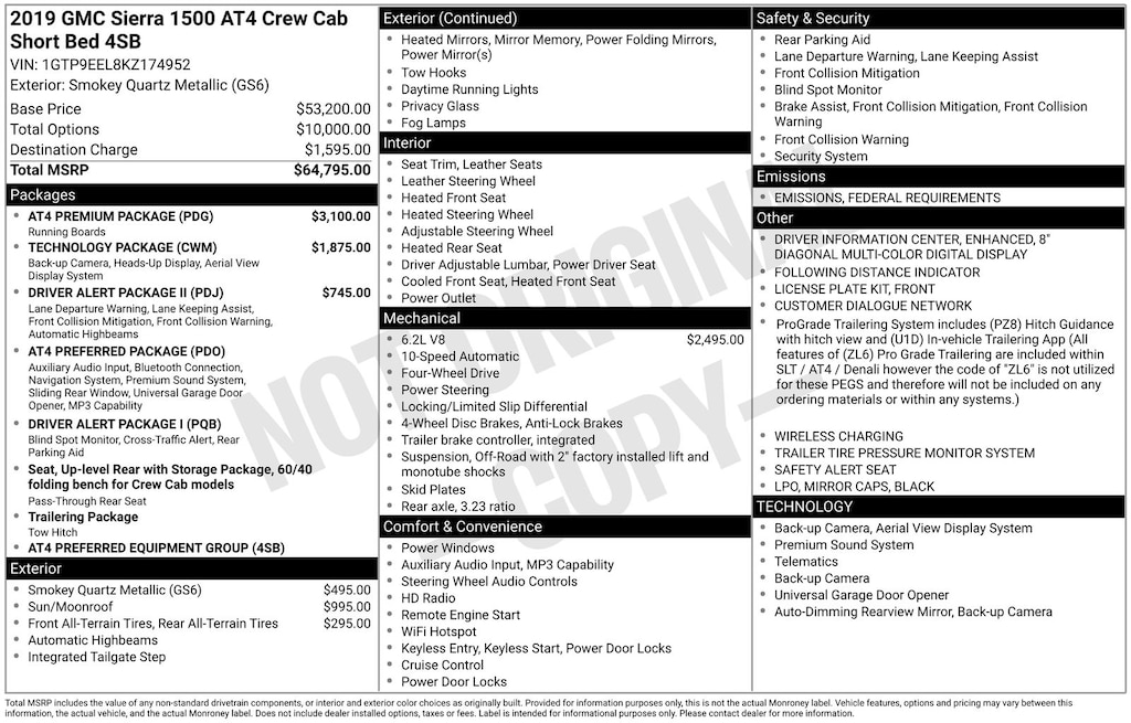 Smokey Quartz Metallic 2019 GMC Sierra 1500 AT4 4WD 10-Speed Automatic EcoTec3 6.2L V8 10-Speed Automatic, 4WD, Jet Black With Kalahari Accents Leather, 12-Volt Rear Auxiliary Power Outlet, 120-Volt Bed Mounted Power Outlet, 120-Volt Instrument Panel Power Outlet, 170 Amp Alternator, 2 USB Ports, 2 USB Ports (1st Row), 4.2" Diagonal Color Display Driver Info Center, 8" Driver Information Center, All-Weather Floor Liner (LPO), AT4 Preferred Package, AT4 Premium Package, Auxiliary External Transmission Oil Cooler, Black Mirror Caps (LPO), Body-Color Surround Grille, Color-Keyed Carpeting Floor Covering, Compass, Deep-Tinted Glass, Driver Alert Package I, Driver Alert Package II, Electric Rear-Window Defogger, Electrical Lock Control Steering Column, Floor Mounted Console, Following Distance Indicator, Forward Collision Alert, Front Pedestrian Braking, GMC 4G LTE, GMC Connected Access, HD Radio, HD Rear Vision Camera, HD Surround Vision, Heated 2nd Row Outboard Seats, Heated Driver & Front Passenger Seating, Heavy-Duty Rear Locking Differential, High-Capacity Air Filter, Hill Descent Control, Hitch Guidance, Hitch Guidance w/Hitch View, In-Vehicle Trailering App, Integrated Trailer Brake Controller, IntelliBeam Automatic High Beam On/Off, Keyless Open & Start, Lane Change Alert w/Side Blind Zone Alert, Lane Keep Assist w/Lane Departure Warning, LED Cargo Area Lighting, Low Speed Forward Automatic Braking, Manual Tilt-Wheel & Telescoping Steering Column, Multi-Color 15" Diagonal Head-Up Display, OnStar & GMC Connected Services Capable, Perimeter Lighting, Power Door Locks, Power Front Passenger Windows w/Express Up/Down, Power Front Windows w/Driver Express Up/Down, Power Rear Windows w/Express Down, Power Sliding Rear Window w/Rear Defogger, Preferred Equipment Group 4SB, Premium Bose 7-Speaker Sound System, Radio: Premium GMC Infotainment Sys w/Navigation, Rear Camera Mirror, Rear Cross Traffic Alert, Rear Dual USB Charging-Only Ports, Rear Wheelhouse Liners, Red Recovery Hooks, Remote Vehicle Starter System, Safety Alert Seat, SiriusXM Radio, Spray-On Pickup Bed Liner w/AT4 Logo, Steering Wheel Audio Controls, Technology Package, Theft Deterrent System (Unauthorized Entry), Trailer Tire Pressure Monitor System, Trailering Package, Ultrasonic Front & Rear Park Assist, Universal Home Remote, Ventilated Driver & Front Passenger Seats, Wireless Charging.