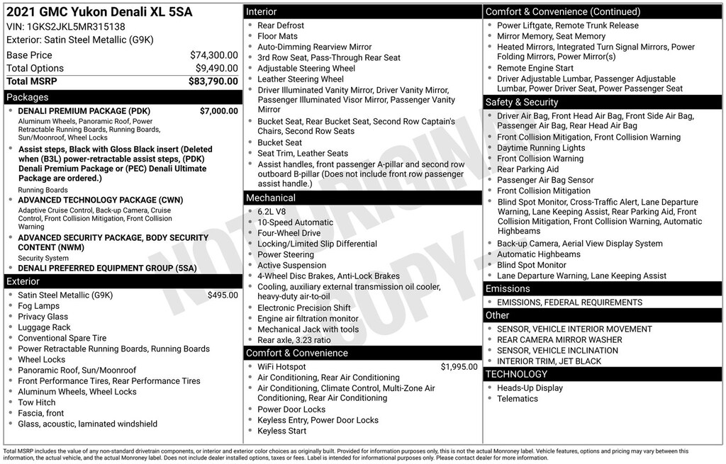 Advanced Security Package (Glass Breakage Sensor, Theft-Deterrent Alarm System, Vehicle Inclination Sensor, and Vehicle Interior Movement Sensor), Advanced Technology Package (Adaptive Cruise Control, Enhanced Automatic Emergency Braking, Inside Rearview Auto-Dimming Rear Camera Mirror, and Rear Camera Mirror Washer), Denali Premium Package (Dual-Pane Panoramic Power Sunroof and Power-Retractable Assist Steps), Preferred Equipment Group 5SA (12-Way Power Seat Adjusters, 15" Diagonal Multi-Color Head-Up Display, 2 Presets For Outside Rearview Mirrors, 3rd Row 60/40 Power-Folding Split-Bench Seat, Bright Front & Rear Door Sill Plates, Chrome Door Handles w/Body-Color Strip, Dual Exhaust System, Galvano Bodyside Moldings, Hands-Free Power Programmable Rear Liftgate, HD Surround Vision, Heated & Ventilated Driver & Front Passenger Seats, Heated 2nd Row Outboard Position Seats, Heated Automatic Steering Wheel, Heated Driver & Front Passenger Seats, Hill Descent Control, Inside Rear-View Auto-Dimming Mirror, Outside Heated Power-Adjustable Mirrors, Power Release 2nd Row Bucket Seats, Power Tilt & Telescopic Steering Column, Rear Pedestrian Alert, Safety Alert Seat, and Universal Home Remote), 4WD, 14 Speakers, 3.23 Rear Axle Ratio, 3rd row seats: split-bench, 4-Wheel Disc Brakes, ABS brakes, Adaptive suspension, Air Conditioning, Alloy wheels, AM/FM radio: SiriusXM with 360L, Apple CarPlay/Android Auto, Auto High-beam Headlights, Auto-dimming door mirrors, Auto-dimming Rear-View mirror, Auto-leveling suspension, Automatic Emergency Braking, Automatic temperature control, Bodyside moldings, Bose 14-Speaker Surround w/CenterPoint, Brake assist, Bumpers: body-color, Compass, Delay-off headlights, Driver door bin, Driver vanity mirror, Dual front impact airbags, Dual front side impact airbags, Electronic Stability Control, Emergency communication system: OnStar and GMC connected services capable, Following Distance Indicator, Forward Collision Alert, Four wheel independent suspension, Front & Rear Park Assist, Front anti-roll bar, Front Bucket Seats, Front Center Armrest, Front dual zone A/C, Front fog lights, Front Pedestrian Braking, Front reading lights, Fully automatic headlights, Garage door transmitter, HD Radio, Heads-Up Display, Heated door mirrors, Heated front seats, Heated rear seats, Heated steering wheel, Illuminated entry, IntelliBeam Automatic High Beam On/Off, Jet Black Interior Trim, Lane Change Alert w/Side Blind Zone Alert, Lane Keep Assist w/Lane Departure Warning, Leather steering wheel, Low tire pressure warning, Magnetic Ride Control Suspension, Memory seat, Navigation System, Occupant sensing airbag, Outside temperature display, Overhead airbag, Overhead console, Panic alarm, Passenger door bin, Passenger vanity mirror, Perforated Leather Seating Surfaces, Power door mirrors, Power driver seat, Power Liftgate, Power passenger seat, Power steering, Power windows, Radio: AM/FM/SiriusXM w/Navigation, Rain sensing wipers, Rear air conditioning, Rear anti-roll bar, Rear Cross Traffic Alert, Rear reading lights, Rear Seat Media System, Rear window defroster, Rear window wiper, Remote keyless entry, Roof rack: rails only, Security system, SiriusXM w/360L, Speed control, Speed-sensing steering, Split folding rear seat, Spoiler, Steering wheel memory, Steering wheel mounted audio controls, Tachometer, Telescoping steering wheel, Tilt steering wheel, Traction control, Trip computer, Turn signal indicator mirrors, Variably intermittent wipers, Ventilated front seats, Voltmeter, Wheel Locks, Wheels: 20" x 9" 6-Spoke Polished Aluminum, and Wheels: 22" x 9" Bright Machined Aluminum. Recent Arrival!