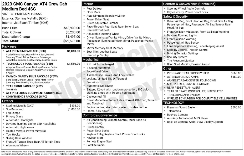 AT4 Premium Package (6-Way Power Passenger Seat Adjuster, Driver & Front Passenger Ventilated Seats, Driver Memory, Driver Seatback Map Pocket, Heated Steering Wheel, Perforated Leather-Appointed Seat Trim, Power Passenger Lumbar Control Seat Adjuster, Rear Center Fold-Down Armrest w/2 Cupholders, and Wireless Charging), Canyon Safety Plus Package (Blind Zone Steering Assist, Rear Cross Traffic Braking, and Ultrasonic Rear Park Assist), Preferred Equipment Group 4SG (120-Volt Bed Mounted Power Outlet, 2 Rear USB Ports in Center Console (Charge-Only), 8-Way Power Driver Seat Adjuster, Automatic Emergency Braking, Automatic Locking Rear Differential, Canyon Pro Safety, Driver & Front Passenger Illuminated Visors, Dual-Zone Automatic Air Conditioning, EZ-Lift & Lower Tailgate, Following Distance Indicator, Forward Collision Alert, Front LED Fog Lamps, Front Pedestrian & Bicyclist Braking, Heated Driver & Front Passenger Seats, Heated Power-Adjustable Outside Mirrors, Inside Rear-View Auto-Dimming Mirror, IntelliBeam Automatic High Beam On/Off, Interior Overhead Courtesy Light w/Dual Reading Lamp, Lane Keep Assist w/Lane Departure Warning, Manual Rear-Sliding Window, MultiStow Tailgate, Power Driver Lumbar Control Seat Adjuster, Rear of Console 120-Volt Power Outlet, Rear-Window Electric Defogger, Remote Vehicle Starter System, Tailgate Keyed Cylinder Lock, and Tilt & Telescopic Manual Steering Column), ProGrade Trailering System (Trailering App System), Technology Plus Package (Adaptive Cruise Control, HD Surround Vision, Multicolor 6.3" Diagonal Head-Up Display, and Rear Pedestrian Alert), Trailering Package (Integrated Trailer Brake Controller), 4WD, 2 1st Row USB Charge/Data Ports, 220 Amps Alternator, 3.42 Rear Axle Ratio, 4-Way Manual Front Passenger Seat Adjuster, 4-Wheel Disc Brakes, 6 Speakers, 6-Speaker Audio System Feature, ABS brakes, Air Conditioning, Alloy wheels, AM/FM radio: SiriusXM, Apple CarPlay/Android Auto, Auto High-beam Headlights, Auto-dimming Rear-View mirror, Automatic Stop/Start, Automatic temperature control, Brake assist, Bumpers: body-color, Cloth/CoreTec Seat Trim, Compass, Delay-off headlights, Driver door bin, Driver Mode Selector, Driver vanity mirror, Dual front impact airbags, Dual front side impact airbags, Electronic Stability Control, Front anti-roll bar, Front Bucket Seats, Front Center Armrest, Front dual zone A/C, Front fog lights, Front Passenger Seatback Map Pocket, Front reading lights, Front wheel independent suspension, Heated door mirrors, Heated front seats, Illuminated entry, Low tire pressure warning, Navigation System, Occupant sensing airbag, Outside temperature display, Overhead airbag, Overhead console, Panic alarm, Passenger door bin, Passenger vanity mirror, Power door mirrors, Power driver seat, Power Inner Sliding Glass Sunroof w/Manual Shade, Power steering, Power windows, Premium 7-Speaker Bose Sound System, Radio data system, Radio: 11.3" Diagonal Premium GMC Infotainment Sys, Rear reading lights, Rear step bumper, Rear window defroster, Remote keyless entry, Security system, SiriusXM w/360L, Speed control, Speed-sensing steering, Split folding rear seat, Steering wheel mounted audio controls, Stop/Start System Disable Button Engine Control, Tachometer, Telescoping steering wheel, Tilt steering wheel, Traction control, Trip computer, Variably intermittent wipers, Wheels: 18" x 8.5" Dark Gray Machined Finish Alum, and Wireless Apple CarPlay/Wireless Android Auto. Recent Arrival!