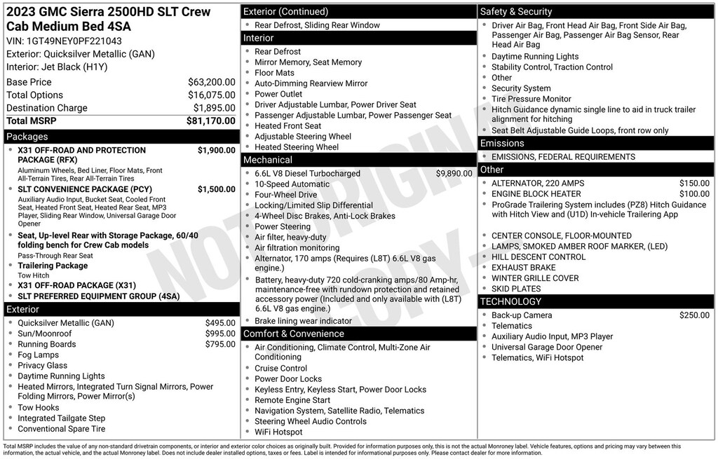 Preferred Equipment Group 4SA (12-Volt Rear Auxiliary Power Outlet, 120-Volt Bed Mounted Power Outlet, 120-Volt Instrument Panel Power Outlet, 2-Speed Active Transfer Case, 2nd Row Dual USB Charge-Only Ports, 4.2" Diagonal Color Display Driver Info Center, Chrome Surround Grille w/High Gloss Black Mesh, Compass Located In Instrument Cluster, Deep-Tinted Glass, Electric Rear-Window Defogger, Electrical Lock Control Steering Column, GMC Connected Access Capable, Integrated Trailer Brake Controller, Keyless Open & Start, LED Cargo Area Lighting, Manual Tilt-Wheel/Telescoping Steering Column, OnStar & GMC Connected Services Capable, Power Door Locks, Power Front Passenger Windows w/Express Up/Down, Power Rear Windows w/Express Down, Power Windows w/Driver Express Up/Down, Rear Wheelhouse Liners, Remote Vehicle Starter System, Steering Wheel Audio Controls, Unauthorized Entry Theft-Deterrent System, Wi-Fi Hotspot Capable, and Wireless Phone Projection), SLT Convenience Package (2 USB Ports, 2 USB Ports (1st Row), Floor-Mounted Center Console, Front Bucket Seats, Heated & Ventilated Front Bucket Seats, Heated 2nd Row Outboard Seats, LED Smoked Amber Roof Marker Lamps, Power Sliding Rear Window w/Defogger, and Universal Home Remote), Suspension Package, X31 Off-Road & Protection Package (20" Machined Aluminum Wheels, All-Weather Floor Liners (LPO), and Spray-On Pickup Box Bed Liner w/GMC Logo), X31 Off-Road Package (Hill Descent Control and Off-Road Suspension), 10-Speed Automatic, 4WD, Jet Black Leather, 10-Way Power Driver Seat Adjuster w/Lumbar, 10-Way Power Passenger Seat Adjuster w/Lumbar, 18" Machined Aluminum Wheels, 220 Amps Alternator, 4-Wheel Disc Brakes, 6 Speakers, 6-Speaker Audio System Feature, 6" Rectangular Chromed Tubular Assist Steps, ABS brakes, Air Conditioning, Alloy wheels, AM/FM radio: SiriusXM with 360L, Apple CarPlay/Android Auto, Auto-dimming door mirrors, Auto-dimming Rear-View mirror, Automatic temperature control, Bed View Camera w/2 Trailer Camera Provisions, Brake assist, Bumpers: chrome, Compass, Delay-off headlights, Driver door bin, Driver Memory, Driver vanity mirror, Dual front impact airbags, Dual front side impact airbags, Electronic Stability Control, Emergency communication system: OnStar and GMC connected services capable, Engine Block Heater, Exhaust Brake, Front 40/20/40 Split-Bench Seats w/Lockable Storage, Front anti-roll bar, Front Center Armrest w/Storage, Front dual zone A/C, Front fog lights, Front reading lights, Front wheel independent suspension, Fully automatic headlights, Heated door mirrors, Heated Driver & Front Outboard Passenger Seats, Heated front seats, Heated steering wheel, Heavy-Duty 80 Amp Battery, Hitch Guidance w/Hitch View, Illuminated entry, In-Vehicle Trailering System App, Low tire pressure warning, Occupant sensing airbag, Outside temperature display, Overhead airbag, Overhead console, Panic alarm, Passenger door bin, Passenger vanity mirror, Perf Leather-Appointed Front Outboard Seat Trim, Pickup Box, Power door mirrors, Power driver seat, Power passenger seat, Power steering, Power Sunroof, Power windows, Premium audio system: Premium GMC Infotainment System, Radio: AM/FM w/Premium GMC Infotainment System, Rear reading lights, Rear seat center armrest, Rear step bumper, Rear window defroster, Remote keyless entry, Security system, SiriusXM w/360L, Speed control, Speed-sensing steering, Split folding rear seat, Steering wheel mounted audio controls, Tachometer, Telescoping steering wheel, Tilt steering wheel, Traction control, Trip computer, Turn signal indicator mirrors, Variably intermittent wipers, Voltmeter, and Winter Grille Cover. Recent Arrival!