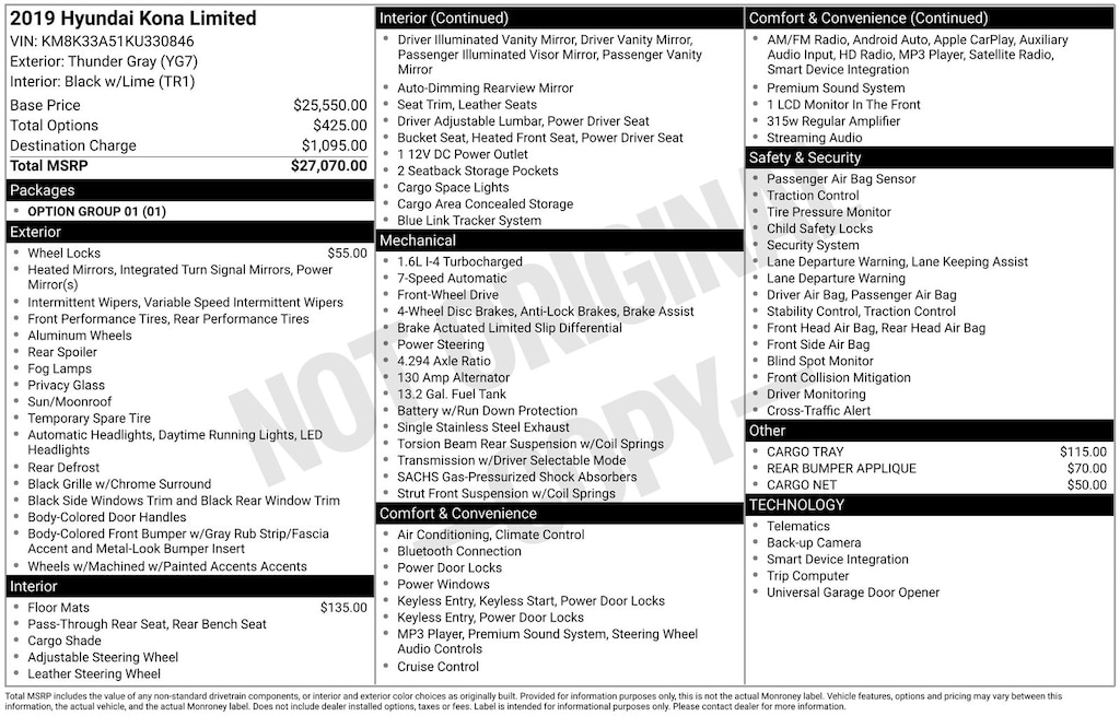 Highlighted by a sleek, modern exterior in a stunning Gray color, the Kona Limited boasts an array of premium amenities that set it apart. Indulge in the convenience of the available - Cargo Tray, Rear Bumper Applique, and the Option Group 01 package, tailored to meet your needs.