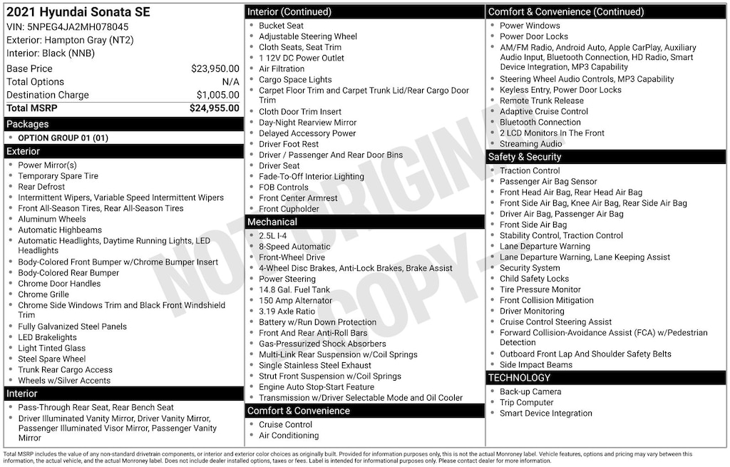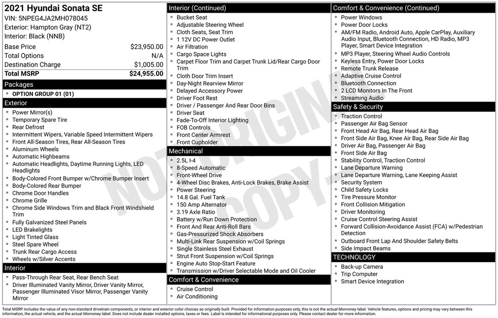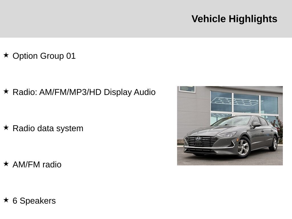 Hampton Gray 2021 Hyundai Sonata SE FWD 8-Speed Automatic with Overdrive 2.5L I4 Black Cloth, 6 Speakers, AM/FM radio, Option Group 01, Radio data system, Radio: AM/FM/MP3/HD Display Audio.