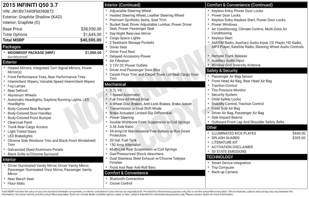 Graphite Shadow 2015 INFINITI Q50 AWD 7-Speed Automatic with Manual Shift 3.7L V6 DOHC 24V