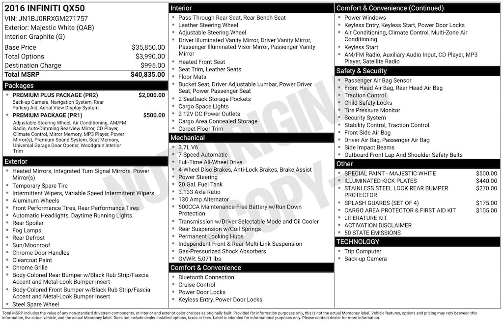 Premium Package (Advanced Climate Control System, Aluminum Roof Rails, Auto-Dimming Inside Mirror, Bose 11-Speaker Premium Audio System, Dual Occupant Memory System For Driver's Seat, HomeLink Universal Transceiver, Maple Interior Accents, Outside Mirrors w/Reverse Tilt-Down Feature, Power Tilt & Telescopic Steering Column, and Radio: AM/FM/CD/DVD w/MP3 Playback Capability), Premium Plus Package (Around View Monitor (AVM), INFINITI Navigation System, and Streaming Audio via Bluetooth Wireless Technology), 3.133 Axle Ratio, 4-Wheel Disc Brakes, 6 Speakers, ABS brakes, Activation Disclaimer, Air Conditioning, Alloy wheels, AM/FM radio: SiriusXM, Anti-whiplash front head restraints, Automatic temperature control, Brake assist, Bumpers: body-color, Cargo Area Protector & First Aid Kit, CD player, Delay-off headlights, Driver door bin, Driver vanity mirror, Dual front impact airbags, Dual front side impact airbags, Electronic Stability Control, Four wheel independent suspension, Front anti-roll bar, Front Bucket Seats, Front Center Armrest, Front dual zone A/C, Front fog lights, Front reading lights, Heated door mirrors, Heated Front Bucket Seats, Heated front seats, Illuminated entry, Illuminated Kick Plates, Independent Front & Rear Multi-Link Suspension, Leather Appointed Seat Trim, Leather Shift Knob, Leather steering wheel, Literature Kit, Low tire pressure warning, Occupant sensing airbag, Outside temperature display, Overhead airbag, Overhead console, Panic alarm, Passenger door bin, Passenger vanity mirror, Power door mirrors, Power driver seat, Power moonroof, Power passenger seat, Power steering, Power windows, Radio data system, Radio: AM/FM/CD w/6 Speaker Audio System, Rear anti-roll bar, Rear reading lights, Rear seat center armrest, Rear window defroster, Rear window wiper, Remote keyless entry, Security system, Special Paint - Majestic White, Speed control, Speed-sensing steering, Speed-Sensitive Wipers, Splash Guards (Set of 4), Split folding rear seat, Spoiler, Stainless Steel Look Rear Bumper Protector, Steering wheel mounted audio controls, Tachometer, Telescoping steering wheel, Tilt steering wheel, Traction control, Trip computer, Turn signal indicator mirrors, Variably intermittent wipers, and Wheels: 18" x 8.0" 8-Spoke Aluminum Alloy. Recent Arrival!