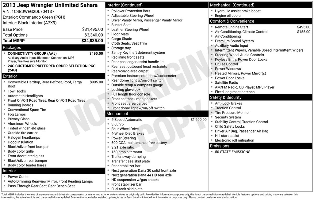 Connectivity Group (Tire Pressure Monitoring Display and Vehicle Information Center), Quick Order Package 24G, 18" x 7.5" Polished Satin Carbon Wheels, 3.21 Rear Axle Ratio, 4-Wheel Disc Brakes, 7 Speakers, ABS brakes, Air Conditioning, Air Conditioning w/Auto Temperature Control, Air Filtering, Alloy wheels, AM/FM radio: SIRIUS, Audio Jack Input for Mobile Devices, Auto-dimming Rear-View mirror, Black 3-Piece Hard Top, Brake assist, CD player, Cloth Bucket Seats, Compass, Driver door bin, Driver vanity mirror, Dual front impact airbags, Electronic Stability Control, Freedom Panel Storage Bag, Front anti-roll bar, Front Bucket Seats, Front Center Armrest w/Storage, Front fog lights, Front reading lights, Fully automatic headlights, Heated door mirrors, Heavy Duty Suspension w/Gas Shocks, Illuminated entry, Integrated roll-over protection, Leather steering wheel, Low tire pressure warning, Occupant sensing airbag, Outside temperature display, Panic alarm, Passenger door bin, Passenger vanity mirror, Power door mirrors, Power steering, Power windows, Radio data system, Radio: Uconnect 130 AM/FM/CD/MP3, Rear anti-roll bar, Rear Window Defroster, Rear Window Wiper/Washer, Remote keyless entry, Remote Start System, Security system, Speed control, Split folding rear seat, Steering wheel mounted audio controls, Sunrider Soft Top, Tachometer, Tilt steering wheel, Traction control, Trip computer, and Variably intermittent wipers. Recent Arrival!