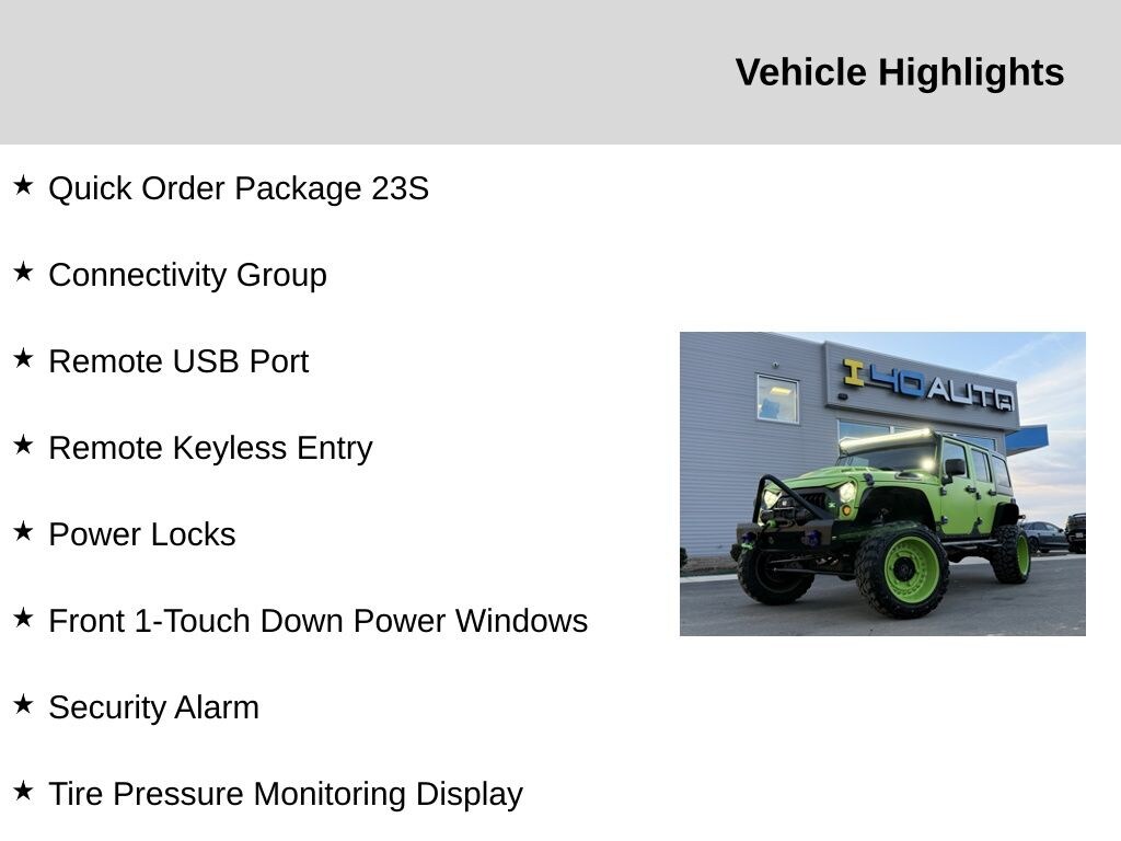 Connectivity Group (Remote USB Port, Tire Pressure Monitoring Display, Uconnect Voice Command w/Bluetooth, and Vehicle Information Center), Quick Order Package 23S (17" x 7.5" Aluminum Wheels, Auto-Dimming Mirror w/Reading Lamp, Chrome/Leather Wrapped Shift Knob, Deep Tint Sunscreen Windows, Front 1-Touch Down Power Windows, Leather Wrapped Steering Wheel, Power Convenience Group, Power Heated Mirrors, Power Locks, Remote Keyless Entry, and Security Alarm), 1-Yr SiriusXM Radio Service, 16" x 7.0" Luxury Styled Steel Wheels, 3.21 Rear Axle Ratio, 4-Wheel Disc Brakes, 8 Speakers, ABS brakes, Air Conditioning, Alpine 9-Speaker w/All Weather Subwoofer, AM/FM radio, Anti-Spin Differential Rear Axle, Black 3-Piece Hard Top, Brake assist, CD player, Cloth Seats w/Adjustable Head Restraints, Compass, Delete Sunrider Soft Top, Driver door bin, Driver vanity mirror, Dual front impact airbags, Electronic Stability Control, Freedom Panel Storage Bag, Front anti-roll bar, Front Bucket Seats, Front Center Armrest w/Storage, Front fog lights, Integrated roll-over protection, Low tire pressure warning, Manufacturer's Statement of Origin, MOPAR Slush Mats, Normal Duty Suspension, Occupant sensing airbag, Outside temperature display, Passenger door bin, Passenger vanity mirror, Power steering, Radio: 130, Rear anti-roll bar, Rear Window Defroster, Rear Window Wiper/Washer, SIRIUS Satellite Radio, Speed control, Split folding rear seat, Steering wheel mounted audio controls, Tachometer, Tilt steering wheel, Traction control, Trip computer, and Variably intermittent wipers. Recent Arrival!