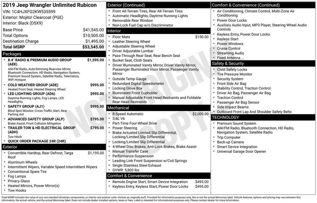8.4" Radio & Premium Audio Group (1-Year SiriusXM Guardian Trial, 4G LTE Wi-Fi Hot Spot, 5-Year SiriusXM Traffic Service, 5-Year SiriusXM Travel Link Service, 8.4" Touchscreen Display, Auto-Dimming Rear-View Mirror, Emergency/Assistance Call, For Details, Visit DriveUconnect.ca, GPS Navigation, HD Radio, Radio: Uconnect 4C Nav w/8.4" Display, SiriusXM Traffic Plus, and SiriusXM Travel Link), Advanced Safety Group (Advanced Brake Assist and Full Speed Forward Collision Warning Plus), Cold Weather Group (Heated Front Seats and Heated Steering Wheel), LED Lighting Group (Daytime Running Lamps LED Accents, Front LED Fog Lamps, LED Reflector Headlamps, and LED Taillamps), Quick Order Package 24R, Safety Group (Blind Spot & Cross Path Detection and ParkSense Rear Park Assist System), Trailer Tow & HD Electrical Group (240 Amp Alternator, 7 & 4 Pin Wiring Harness, 700 Amp Maintenance Free Battery, Auxiliary Switches, and Class II Receiver Hitch), 4-Wheel Disc Brakes, 4.10 Rear Axle Ratio, 8 Speakers, ABS brakes, Air Conditioning, Alloy wheels, Alpine Premium Audio System, AM/FM radio: SiriusXM, Apple CarPlay/Android Auto, Automatic temperature control, Black 3-Piece Hard Top, Brake assist, Compass, Delay-off headlights, Driver door bin, Driver vanity mirror, Dual front impact airbags, Dual front side impact airbags, Electronic Stability Control, Freedom Panel Storage Bag, Front anti-roll bar, Front Bucket Seats, Front Center Armrest w/Storage, Front dual zone A/C, Front fog lights, Front reading lights, Fully automatic headlights, Garage door transmitter, Heated door mirrors, Illuminated entry, Integrated roll-over protection, Leather steering wheel, Low tire pressure warning, MOPAR All-Weather Floor Mats, No Soft Top, Non-Lock Fuel Cap w/o Discriminator, Occupant sensing airbag, Outside temperature display, Panic alarm, ParkView Rear Back-Up Camera, Passenger door bin, Passenger vanity mirror, Performance Suspension, Power door mirrors, Power steering, Power windows, Premium Cloth Low-Back Bucket Seats, Radio data system, Radio: Uconnect 4 w/7" Display, Rear anti-roll bar, Rear reading lights, Rear Window Defroster, Rear Window Wiper/Washer, Remote keyless entry, Remote Proximity Keyless Entry, Remote Start System, Security system, Speed control, Split folding rear seat, Steering wheel mounted audio controls, Tachometer, Telescoping steering wheel, Tilt steering wheel, Traction control, Trip computer, Variably intermittent wipers, Voltmeter, Wheels: 17" x 7.5" Machined w/Black Pockets, and Wheels: 17" x 7.5" Polished w/Black Pockets (DISC) Recent Arrival!