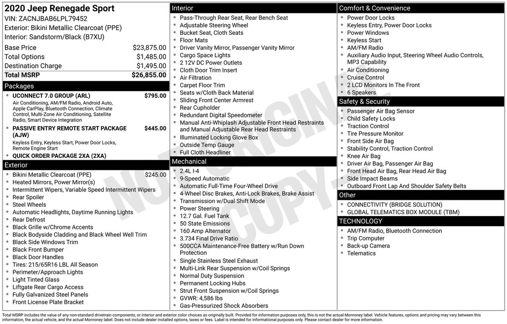 Bikini Metallic Clearcoat 2020 Jeep Renegade Sport 4WD 9-Speed 948TE Automatic 2.4L I4
