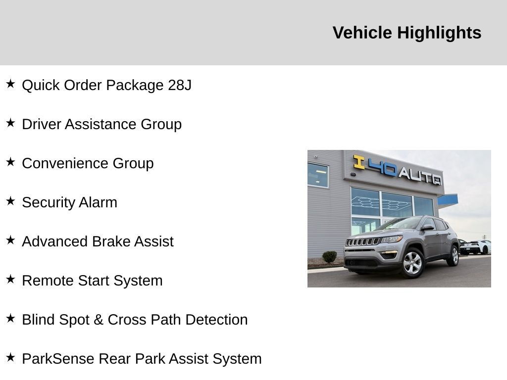 Convenience Group (115V Auxiliary Power Outlet, 4-Way Power Lumbar Adjust, All-Season Floor Mats, Auto-Dimming Rear-View Mirror, Cluster 7.0" Color Driver Info Display, Heated Front Seats, Heated Steering Wheel, Power 8-Way Driver/Manual 6-Way Pass Seat, Remote Start System, Reversible Carpet/Vinyl Cargo Mat, and Windshield Wiper De-Icer), Driver Assistance Group (Adaptive Cruise Control w/Stop & Go, Advanced Brake Assist, Auto High Beam Headlamp Control, Blind Spot & Cross Path Detection, Full Speed FWD Collision Warn Plus, Lane Departure Warning Plus, ParkSense Rear Park Assist System, Rain Sensitive/Intermittent Wipers, and Security Alarm), Quick Order Package 28J, 3.502 Axle Ratio, 4-Wheel Disc Brakes, 6 Speakers, ABS brakes, Air Conditioning, Alloy wheels, AM/FM radio: SiriusXM, Anti-whiplash front head restraints, Apple CarPlay/Android Auto, Automatic temperature control, Brake assist, Bumpers: body-color, Compass, Delay-off headlights, Driver door bin, Driver vanity mirror, Dual front impact airbags, Dual front side impact airbags, Electronic Stability Control, Four wheel independent suspension, Front anti-roll bar, Front Bucket Seats, Front Center Armrest w/Storage, Front dual zone A/C, Front fog lights, Front License Plate Bracket, Front reading lights, Fully automatic headlights, Heated door mirrors, Illuminated entry, Knee airbag, Leather Shift Knob, Low tire pressure warning, Occupant sensing airbag, Outside temperature display, Overhead airbag, Overhead console, Panic alarm, ParkView Rear Back-Up Camera, Passenger door bin, Passenger vanity mirror, Power door mirrors, Power steering, Power windows, Premium Cloth/Vinyl Bucket Seats, Radio: Uconnect 4 w/7" Display, Rear anti-roll bar, Rear seat center armrest, Rear window defroster, Rear window wiper, Remote keyless entry, Roof rack: rails only, Speed control, Split folding rear seat, Spoiler, Steering wheel mounted audio controls, Tachometer, Telescoping steering wheel, Tilt steering wheel, Traction control, Trip computer, Variably intermittent wipers, and Wheels: 17" x 7.0" Silver Painted Aluminum. Recent Arrival! 22/31 City/Highway MPG