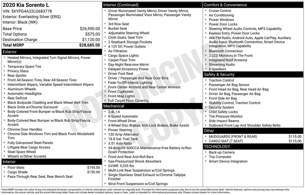 17" x 7.0" Alloy Wheels, 3.51 Axle Ratio, 3rd row seats: split-bench, 4-Wheel Disc Brakes, 6 Speakers, ABS brakes, Air Conditioning, Alloy wheels, AM/FM radio, Apple CarPlay & Android Auto, Brake assist, Bumpers: body-color, Cargo Cover, Cargo Mat (7 Seat), Carpeted Floor Mats (7-Passenger), Delay-off headlights, Driver door bin, Driver vanity mirror, Dual front impact airbags, Dual front side impact airbags, Electronic Stability Control, Exterior Parking Camera Rear, Four wheel independent suspension, Front anti-roll bar, Front Bucket Seats, Front Center Armrest, Front reading lights, Fully automatic headlights, Heated door mirrors, Illuminated entry, Low tire pressure warning, Mudguards (Front & Rear), Occupant sensing airbag, Outside temperature display, Overhead airbag, Overhead console, Panic alarm, Passenger door bin, Passenger vanity mirror, Power door mirrors, Power steering, Power windows, Radio data system, Radio: AM/FM/MP3 Audio System, Rear anti-roll bar, Rear seat center armrest, Rear window defroster, Rear window wiper, Remote keyless entry, Security system, Speed control, Speed-sensing steering, Split folding rear seat, Spoiler, Steering wheel mounted audio controls, Tachometer, Telescoping steering wheel, Tilt steering wheel, Traction control, Trip computer, Turn signal indicator mirrors, Variably intermittent wipers, and YES Essentials Cloth Seat Trim. Recent Arrival! 22/29 City/Highway MPG