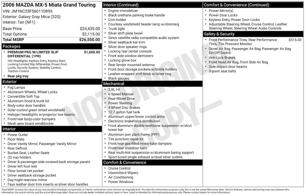 Galaxy Gray Mica 2006 Mazda Miata RWD 5-Speed Manual with Overdrive 2.0L I4 DOHC VVT 16V Tan Leather.