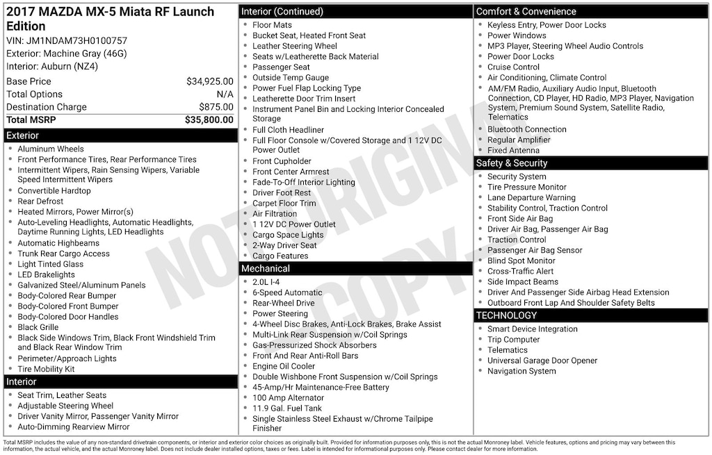 You'll appreciate its safety and technology features! This 2 door, 2 passenger convertible still has less than 80,000 miles! Mazda infused the interior with top shelf amenities, such as: a power convertible roof, power windows, and a blind spot monitoring system. Mazda made sure to keep road-handling and sportiness at the top of it's priority list. Under the hood you'll find a 4 cylinder engine with more than 150 horsepower, and for added security, dynamic Stability Control supplements the drivetrain.