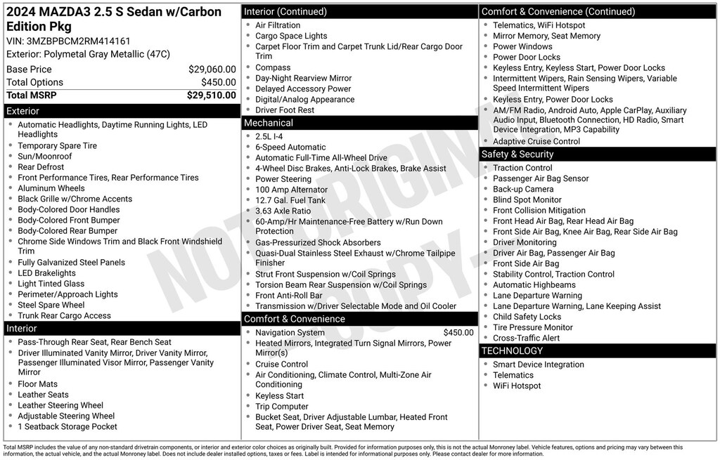 Polymetal Gray Metallic 2024 Mazda Mazda3 2.5 S Carbon Edition AWD 6-Speed Automatic 2.5L I4 DOHC 16V LEV3-SULEV30 191hp