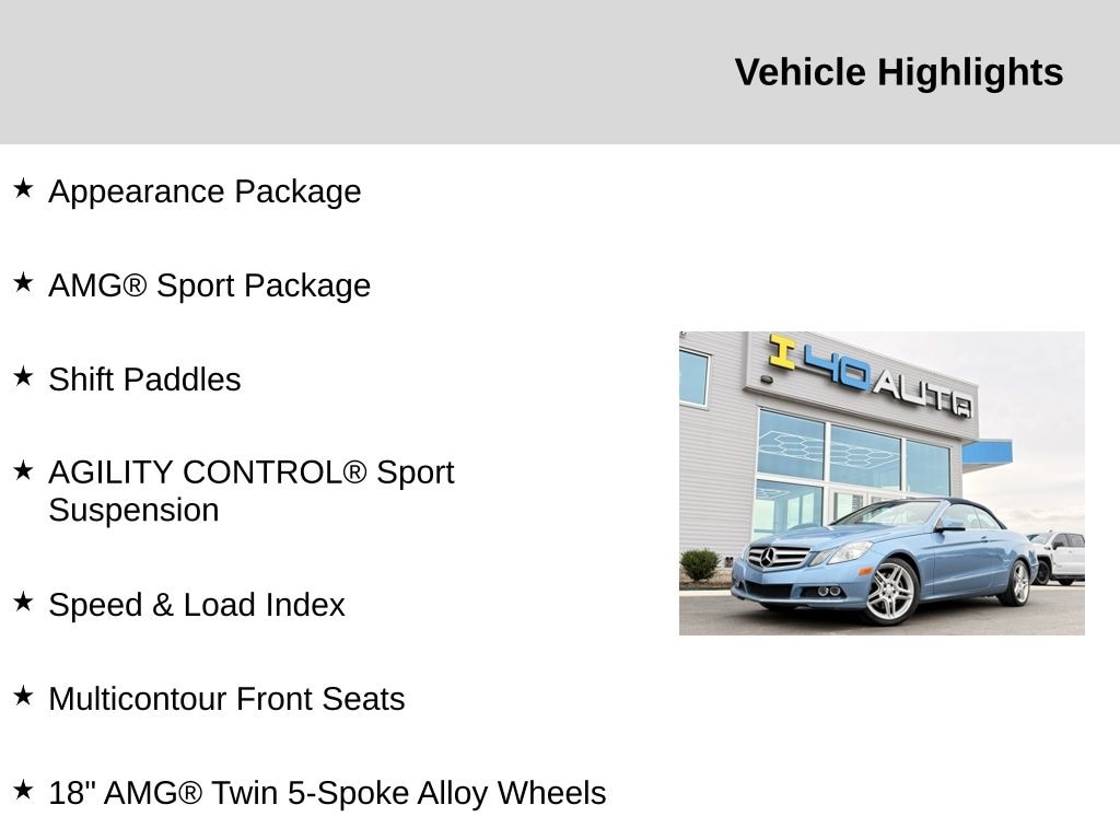 AMG® Sport Package, Appearance Package (18" AMG® Twin 5-Spoke Alloy Wheels, AGILITY CONTROL® Sport Suspension, Multicontour Front Seats, Shift Paddles, and Speed & Load Index), 14-Way Power Adjustable Front Seats, 17" Split 5-Spoke Alloy Wheels, 4-Wheel Disc Brakes, 8 Speakers, ABS brakes, Air Conditioning, Alloy wheels, AM/FM radio, Anti-whiplash front head restraints, Auto tilt-away steering wheel, Auto-dimming door mirrors, Auto-dimming Rear-View mirror, Automatic temperature control, Bodyside moldings, Brake assist, Bumpers: body-color, CD player, Convertible roof lining, Convertible roof wind blocker, Delay-off headlights, Driver door bin, Driver vanity mirror, Dual front impact airbags, Dual front side impact airbags, DVD-Audio, Electronic Stability Control, Four wheel independent suspension, Front anti-roll bar, Front Bucket Seats, Front Center Armrest, Front dual zone A/C, Front fog lights, Front reading lights, Fully automatic headlights, Garage door transmitter: Homelink, Genuine wood console insert, Genuine wood dashboard insert, Genuine wood door panel insert, Glass rear window, Head restraints memory, Heated door mirrors, Illuminated entry, Integrated roll-over protection, Knee airbag, Leather Shift Knob, Leather steering wheel, Leather Upholstery, Low tire pressure warning, Memory seat, Occupant sensing airbag, Outside temperature display, Overhead airbag, Overhead console, Panic alarm, Passenger door bin, Passenger vanity mirror, Power adjustable front head restraints, Power convertible roof, Power door mirrors, Power driver seat, Power passenger seat, Power steering, Power windows, Premium audio system: COMAND®, Radio data system, Radio: COMAND® AM/FM/WB/In-Dash 6-Disc DVD/CD Chger, Rain sensing wipers, Rear anti-roll bar, Rear seat center armrest, Rear window defroster, Remote keyless entry, Security system, Speed control, Speed-sensing steering, Steering wheel memory, Steering wheel mounted audio controls, Tachometer, Telescoping steering wheel, Tilt steering wheel, Traction control, Trip computer, Turn signal indicator mirrors, Variably intermittent wipers, and Weather band radio. Recent Arrival!