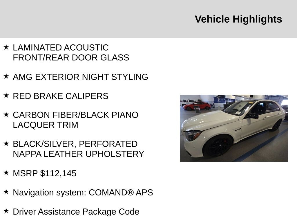 4MATIC®, 14 Speakers, 4-Wheel Disc Brakes, ABS brakes, Active Heated & Ventilated Front Seats, Adaptive suspension, Air Conditioning, Alloy wheels, AM/FM radio: SiriusXM, Anti-whiplash front head restraints, Auto High-beam Headlights, Auto tilt-away steering wheel, Auto-dimming door mirrors, Auto-dimming Rear-View mirror, Auto-leveling suspension, Automatic temperature control, Bodyside moldings, Brake assist, Bumpers: body-color, Burl Walnut Wood Trim, CD player, Delay-off headlights, Driver door bin, Driver vanity mirror, Dual front impact airbags, Dual front side impact airbags, DVD-Audio, Electronic Stability Control, Emergency communication system: mbrace2, Exterior Parking Camera Rear, Four wheel independent suspension, Front anti-roll bar, Front Bucket Seats, Front Center Armrest, Front dual zone A/C, Front reading lights, Fully automatic headlights, Garage door transmitter: Homelink, Genuine wood console insert, Genuine wood dashboard insert, Genuine wood door panel insert, harman/kardon® Speakers, Head restraints memory, Heated door mirrors, Heated front seats, Illuminated entry, Knee airbag, Leather Shift Knob, Leather steering wheel, Low tire pressure warning, Memory seat, Navigation system: COMAND® APS, Occupant sensing airbag, Outside temperature display, Overhead airbag, Overhead console, Panic alarm, Passenger door bin, Passenger vanity mirror, Perforated Nappa Leather Upholstery, Power adjustable front head restraints, Power adjustable rear head restraints, Power door mirrors, Power driver seat, Power moonroof, Power passenger seat, Power steering, Power windows, Premium audio system: COMAND® APS, Radio data system, Radio: COMAND® AM/FM/WB/In-Dash DVD/CD Player, Rain sensing wipers, Rear air conditioning, Rear anti-roll bar, Rear fog lights, Rear reading lights, Rear seat center armrest, Rear Window Blind, Rear window defroster, Remote keyless entry, Security system, Speed control, Speed-sensing steering, Split folding rear seat, Spoiler, Sport steering wheel, Steering wheel memory, Steering wheel mounted audio controls, Tachometer, Telescoping steering wheel, Tilt steering wheel, Traction control, Trip computer, Turn signal indicator mirrors, Variably intermittent wipers, Ventilated front seats, Weather band radio, and Wheels: 19" AMG® 10-Spoke Titanium. Recent Arrival!