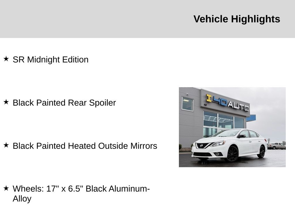 SR Midnight Edition (Black Painted Heated Outside Mirrors, Black Painted Rear Spoiler, and Wheels: 17" x 6.5" Black Aluminum-Alloy), CVT with Xtronic, Charcoal Cloth, 4-Wheel Disc Brakes, 6 Speakers, ABS brakes, Air Conditioning, Alloy wheels, AM/FM radio: SiriusXM, AM/FM/CD Audio System, Brake assist, Bumpers: body-color, CD player, Delay-off headlights, Driver door bin, Driver vanity mirror, Dual front impact airbags, Dual front side impact airbags, Electronic Stability Control, Exterior Parking Camera Rear, Front anti-roll bar, Front Bucket Seats, Front Center Armrest, Front fog lights, Front reading lights, Front wheel independent suspension, Fully automatic headlights, Heated door mirrors, Heated Front Bucket Seats, Heated front seats, Illuminated entry, Leather Shift Knob, Leather-Appointed Seat Trim, Low tire pressure warning, Midnight Edition Floor Mats w/Regular Trunk Mat, Occupant sensing airbag, Outside temperature display, Overhead airbag, Overhead console, Panic alarm, Passenger door bin, Passenger vanity mirror, Power door mirrors, Power steering, Power windows, Premium Sport Cloth Seat Trim, Radio data system, Rear anti-roll bar, Rear seat center armrest, Rear window defroster, Remote keyless entry, Security system, Speed control, Speed-sensing steering, Split folding rear seat, Spoiler, Steering wheel mounted audio controls, Tachometer, Telescoping steering wheel, Tilt steering wheel, Traction control, Trip computer, Turn signal indicator mirrors, Variably intermittent wipers, and Wheels: 17" x 6.5" 10-Spoke Aluminum-Alloy. Recent Arrival! 29/37 City/Highway MPG