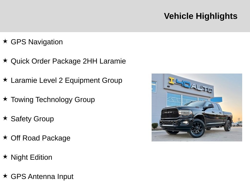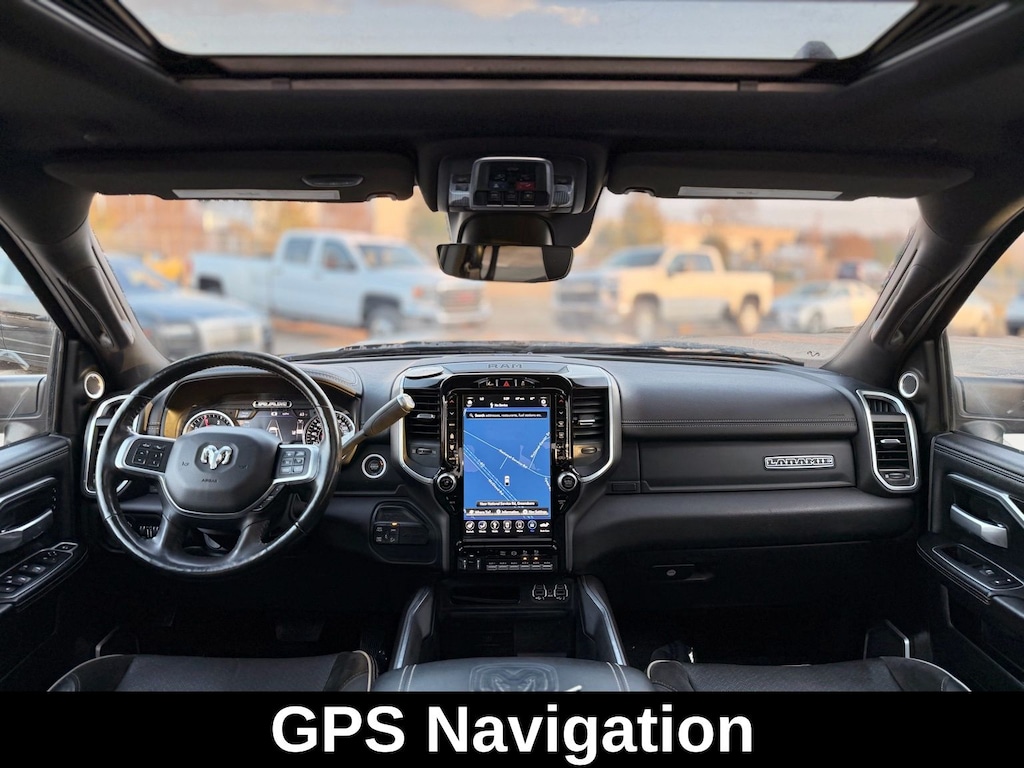 The Laramie Level 2 Equipment Group elevates the driving experience with premium features like ventilated front seats, memory settings for the driver's seat, mirrors, and pedals, and a 12-inch touchscreen display with Uconnect 4C Navigation. The Night Edition package adds a bold, blacked-out aesthetic, including 20-inch black painted aluminum wheels, black exterior badging, and black exterior accents.
