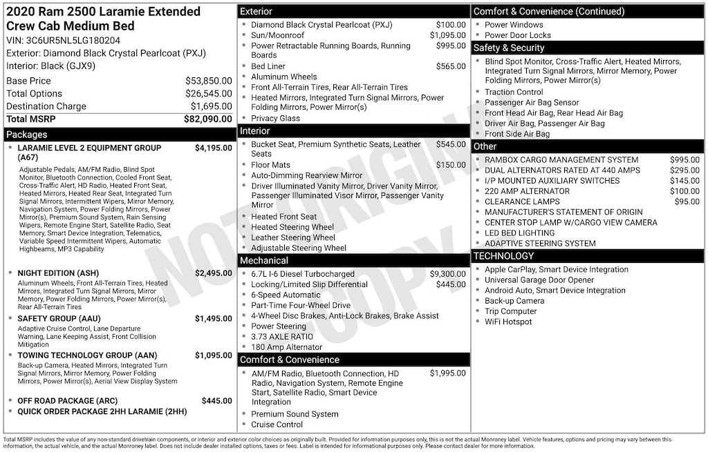 Designed to handle the toughest jobs with ease, this 2020 Ram 2500 Laramie is a true workhorse. The Off-Road Package, with its performance-tuned shock absorbers and hill descent control, ensures you can confidently navigate even the most challenging terrain. The Towing Technology Group, featuring a surround-view camera system and trailer reverse guidance, provides the tools to tow with confidence.